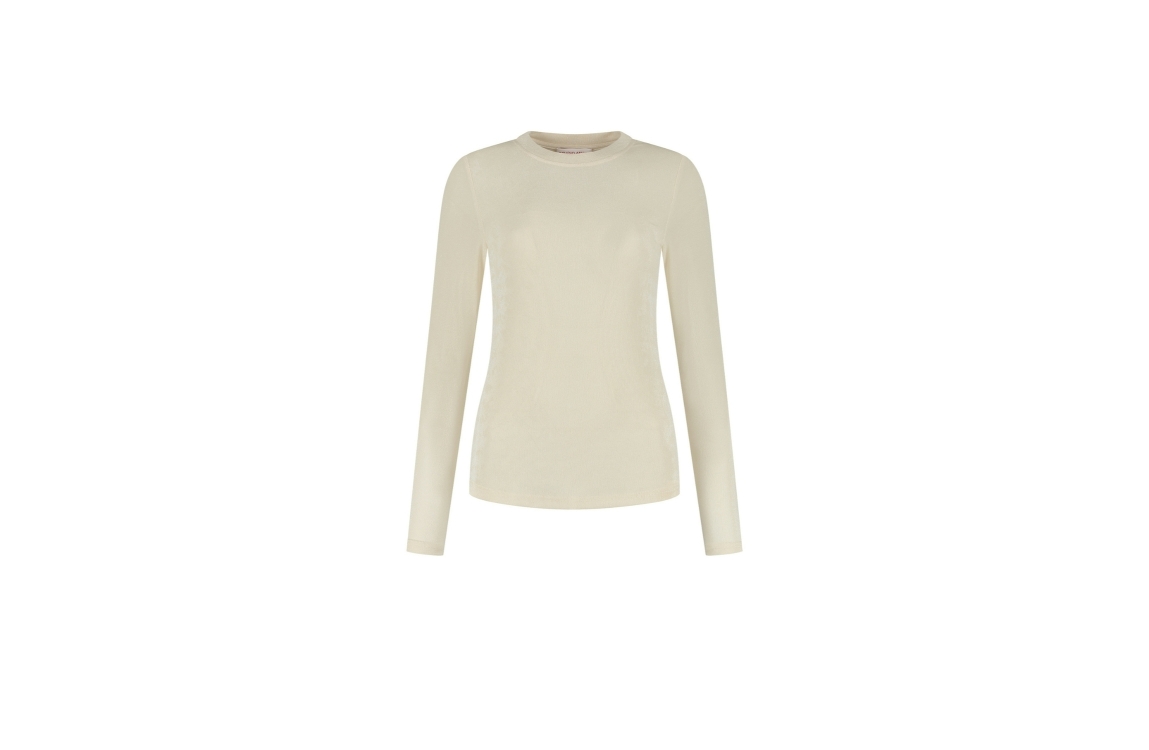 Studio Amaya shirt 253-48. Dit aangesloten model is voorzien van een ronde hals en lange mouwen. Deze beige shirt van Studio Amaya heeft een subtiele glans