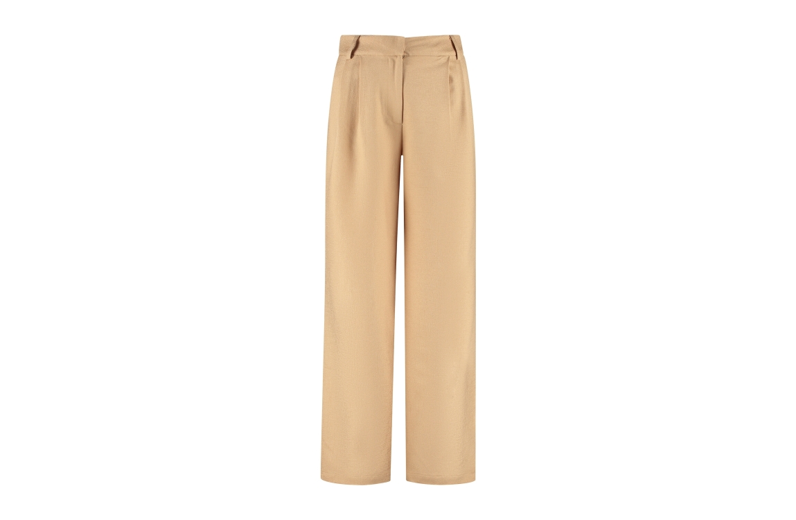 Studio Amaya pants 00053689-10022. Dit wijdvallende model sluit door middel van een haak en rits en heeft twee steekzakken. Deze beige pantalon van Studio Amaya heeft een hoge taille en sierlijke plooien.