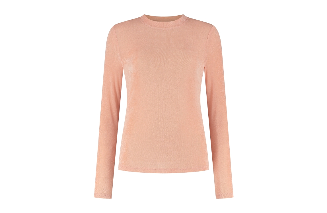 Studio Amaya t-shirt 00053681-10022. Dit aangesloten model is voorzien van een ronde hals en lange mouwen. Deze koraal kleurige t-shirt van Studio Amaya heeft een subtiele glans.
