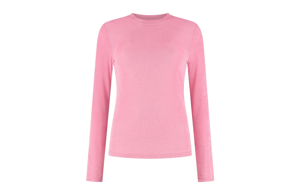 Studio Amaya t-shirt 00053681-10010. Dit aangesloten model is voorzien van een ronde hals en lange mouwen. Deze roze t-shirt van Studio Amaya heeft een subtiele glans.
