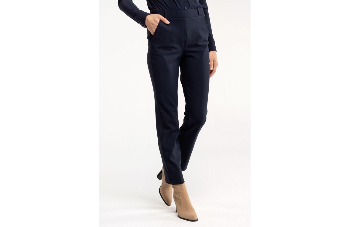 Studio Anneloes Anne bonded trousers 94819. Dit tapered fit model sluit aan de bovenzijde door middel van een elastische tailleband met riemlusjes. Deze donkerblauwe broek van Studio Anneloes is voorzien van steekzakken, fake paspelzakken achter en heeft splitjes in de zoom.