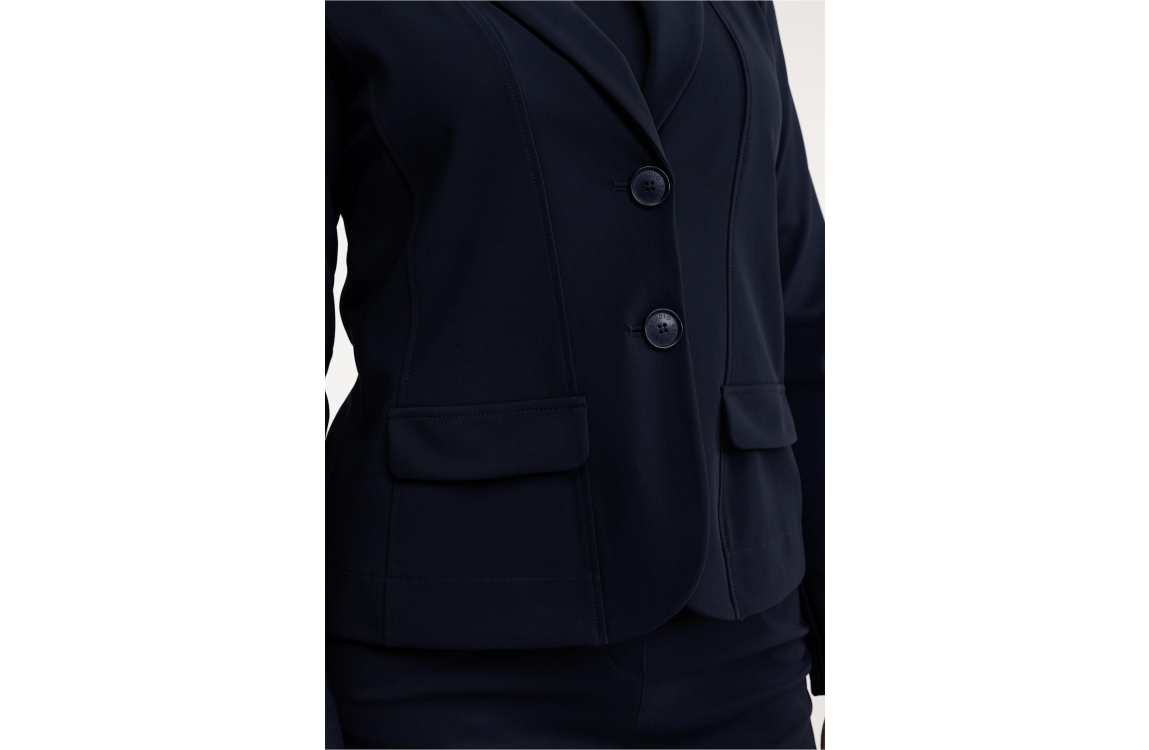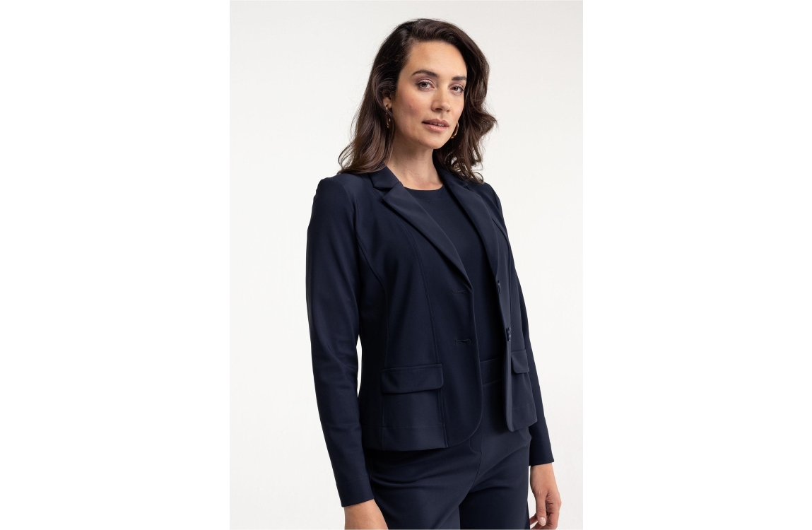 Studio Anneloes Bright bonded blazer 94811. Dit aangesloten model is voorzien van een revers kraag en heeft lange mouwen. Deze donker blauwe korte blazer van Studio Anneloes is aan de voorzijde voorzien van twee knopen en fake klepzakken. Dit model is uitgevoerd in een elastische kwaliteit.