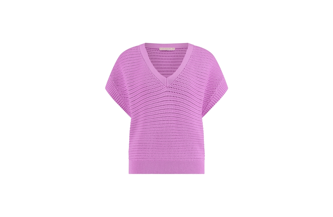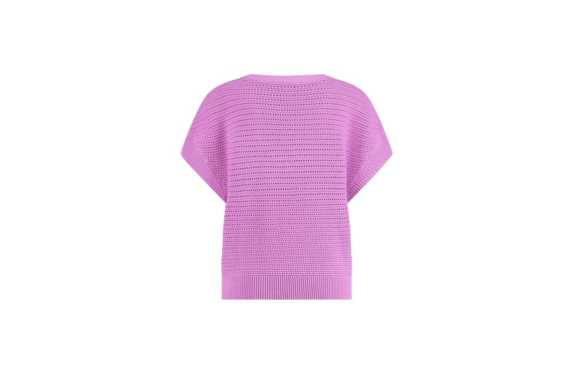Studio Anneloes top Chiara. Dit wijdvallende model is voorzien van een v-hals en heeft korte mouwen. Deze lila-pink top van Studio Anneloes is uitgevoerd in een gehaakte stof voorzien van ribgebreide boorden. Deze top is makkelijk te combineren.