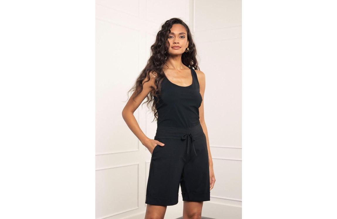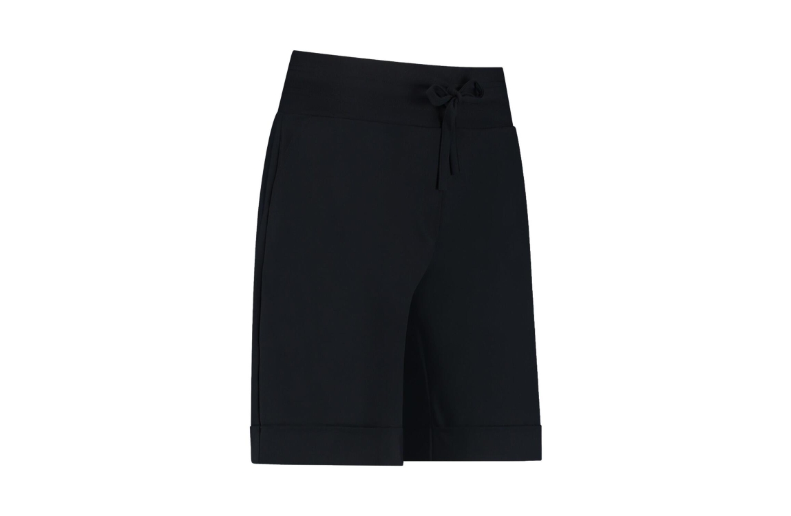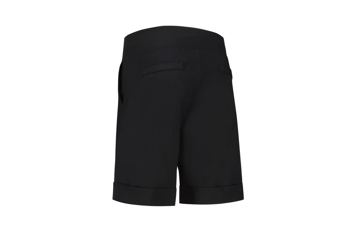 Studio Anneloes Bermuda City 94774. Dit soepelvallende model is voorzien van een elastische boord aan de bovenzijde afgewerkt met een trekkoord. Deze zwarte bermuda van Studio Anneloes is aan de voorzijde voorzien van twee schuine steekzakken, achter twee fake paspel zakken en heeft een omslag.