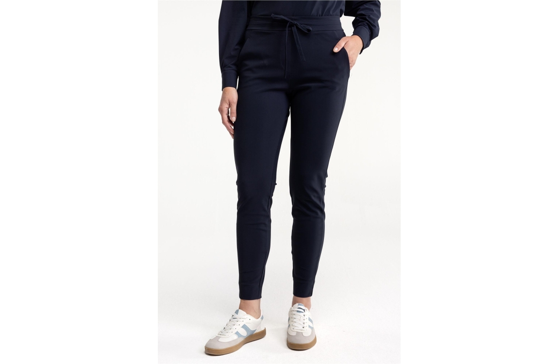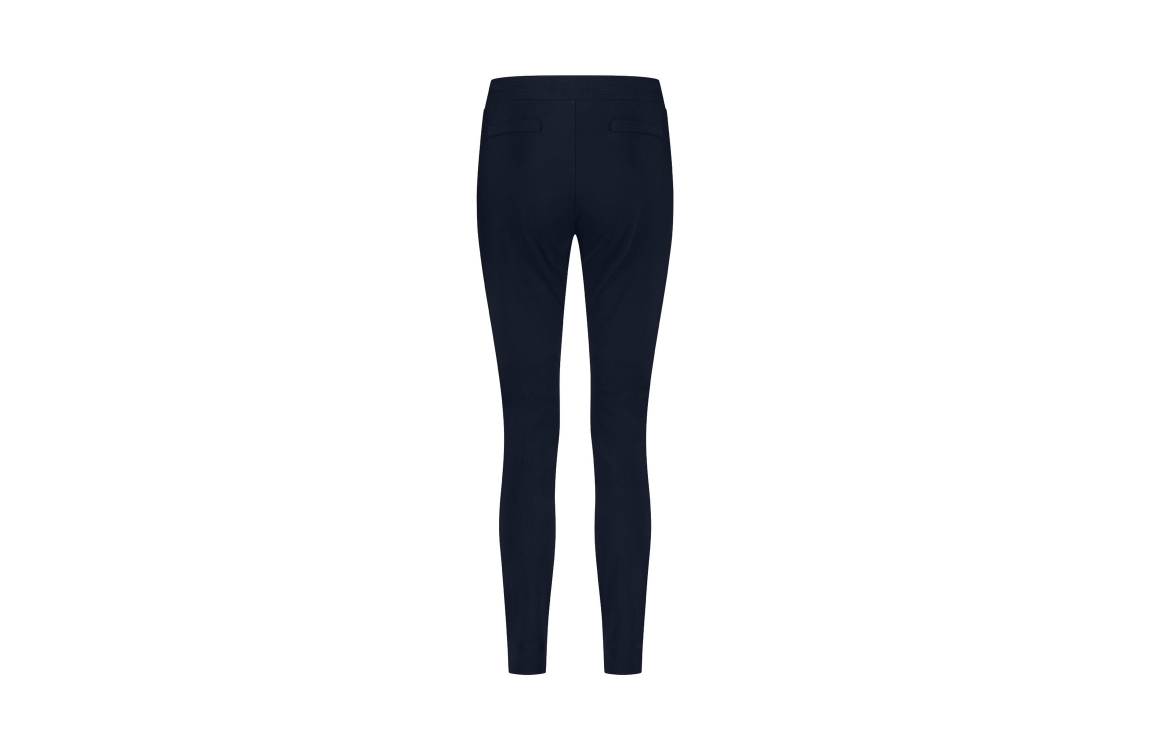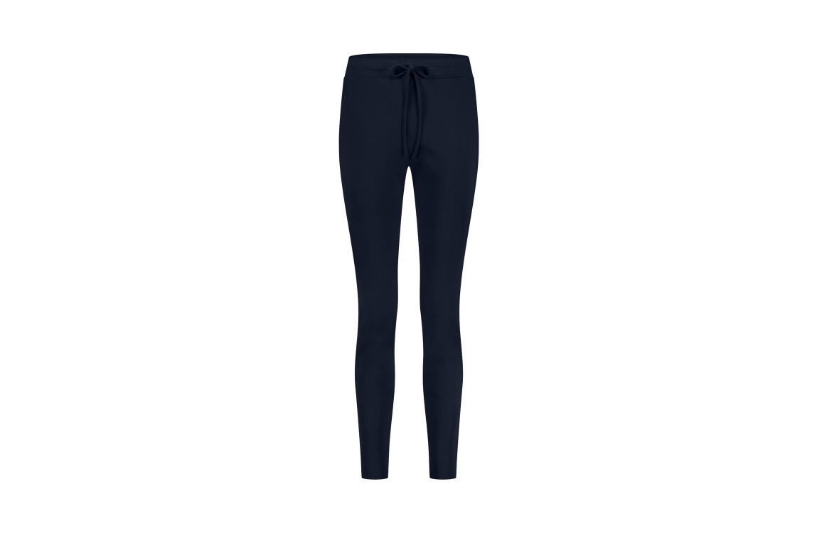 Studio Anneloes Downstairs bonded trousers 94803. Dit slim fit model is voorzien van een elastische boord aan de bovenzijde en afgewerkt met een trekkoord. Deze donkerblauwe broek van Studio Anneloes is voorzien van twee schuine steekzakken, heeft achter twee fake paspel zakken en een splitje in de zoom.