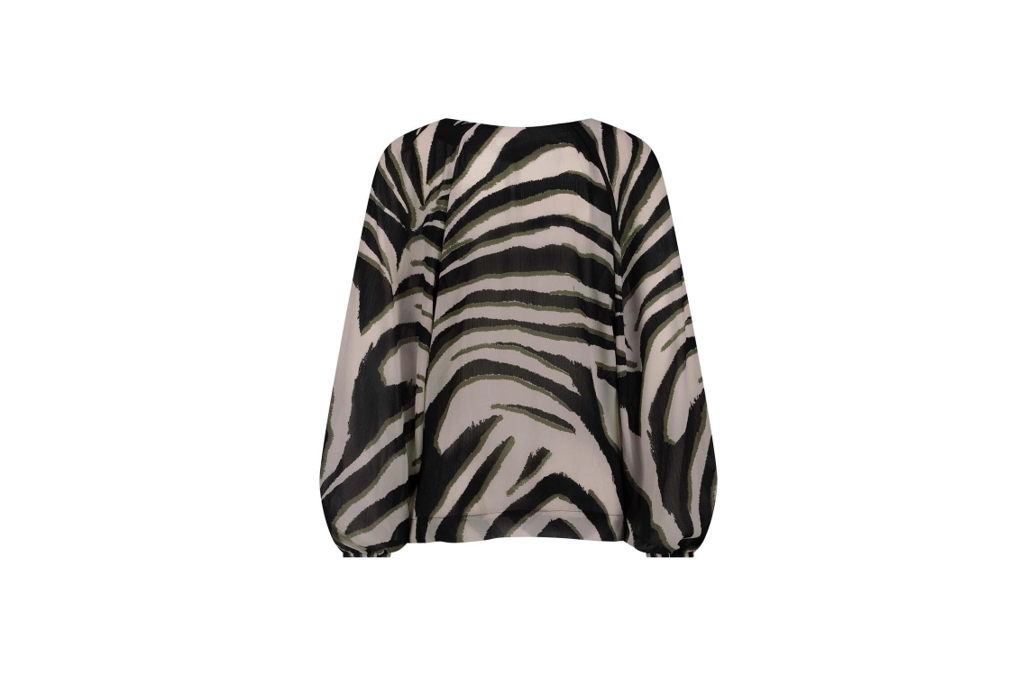 Studio Anneloes elian zebra crepe top. Dit soepelvallende model heeft een v-hals en ballon mouwen. Deze beige kleurige blouse van Studio Anneloes is voorzien van een zwart/groen zebra patroon.