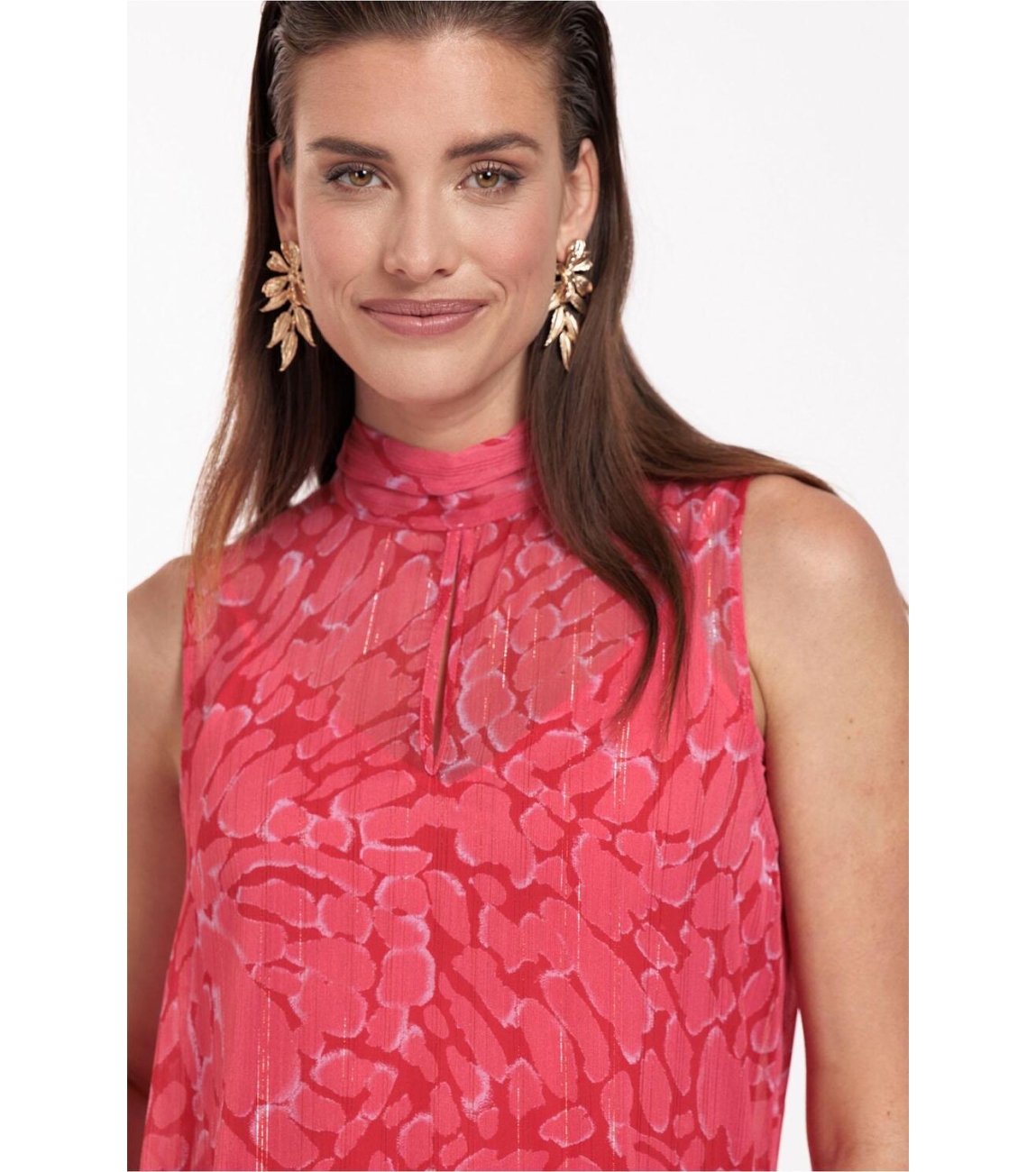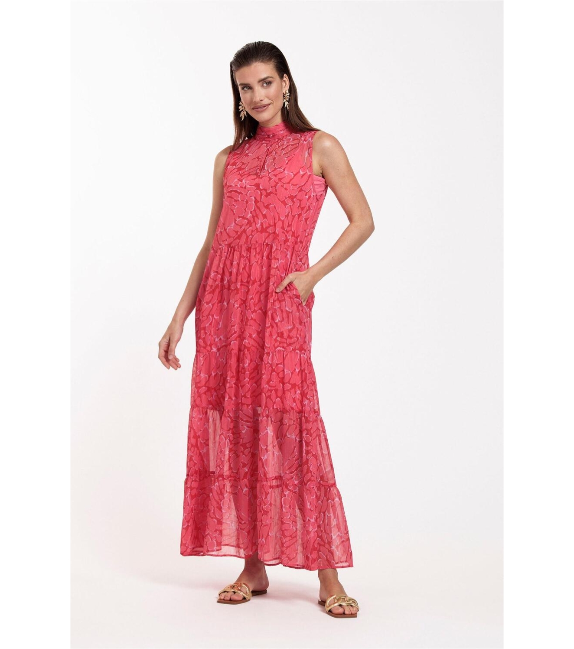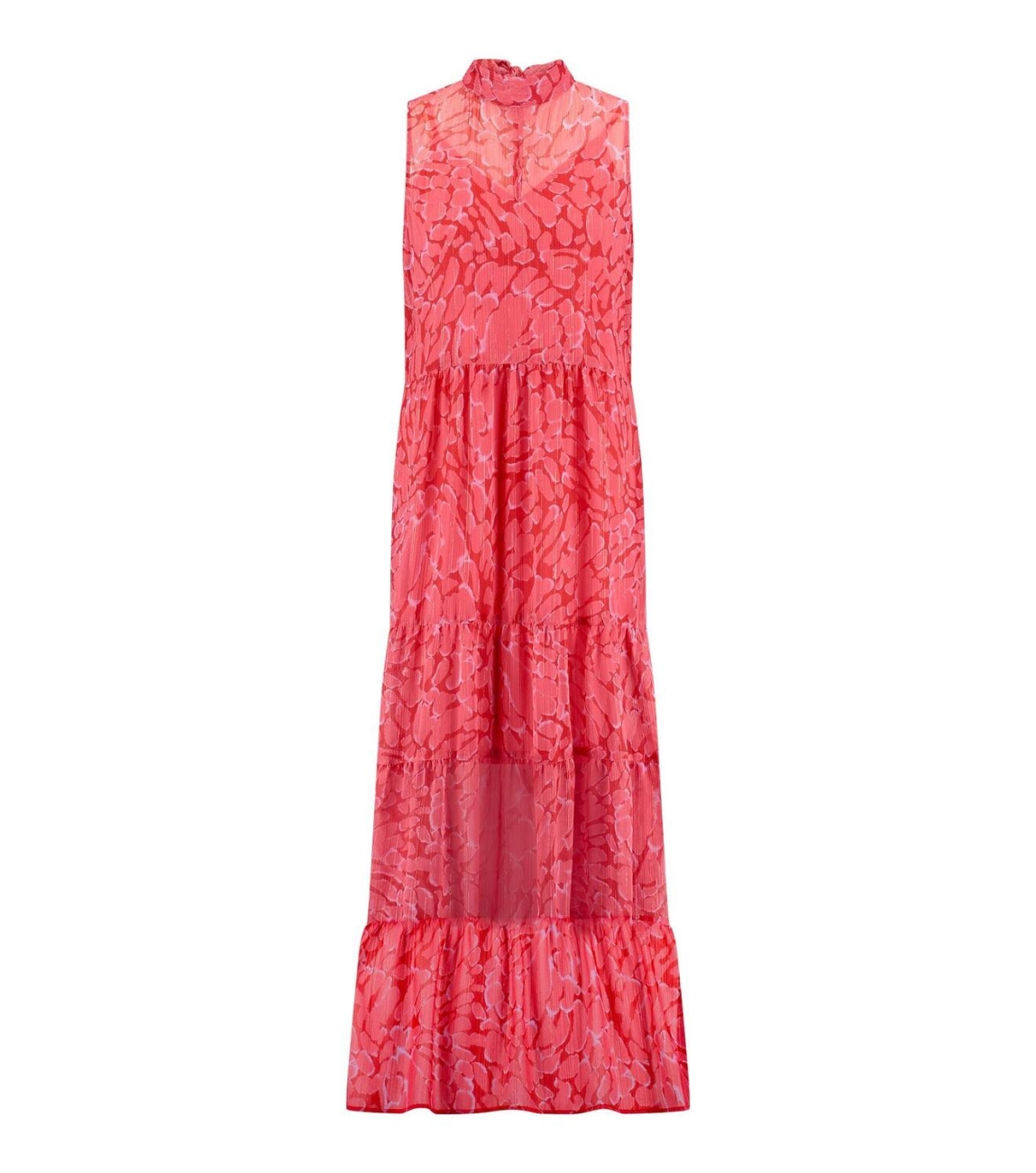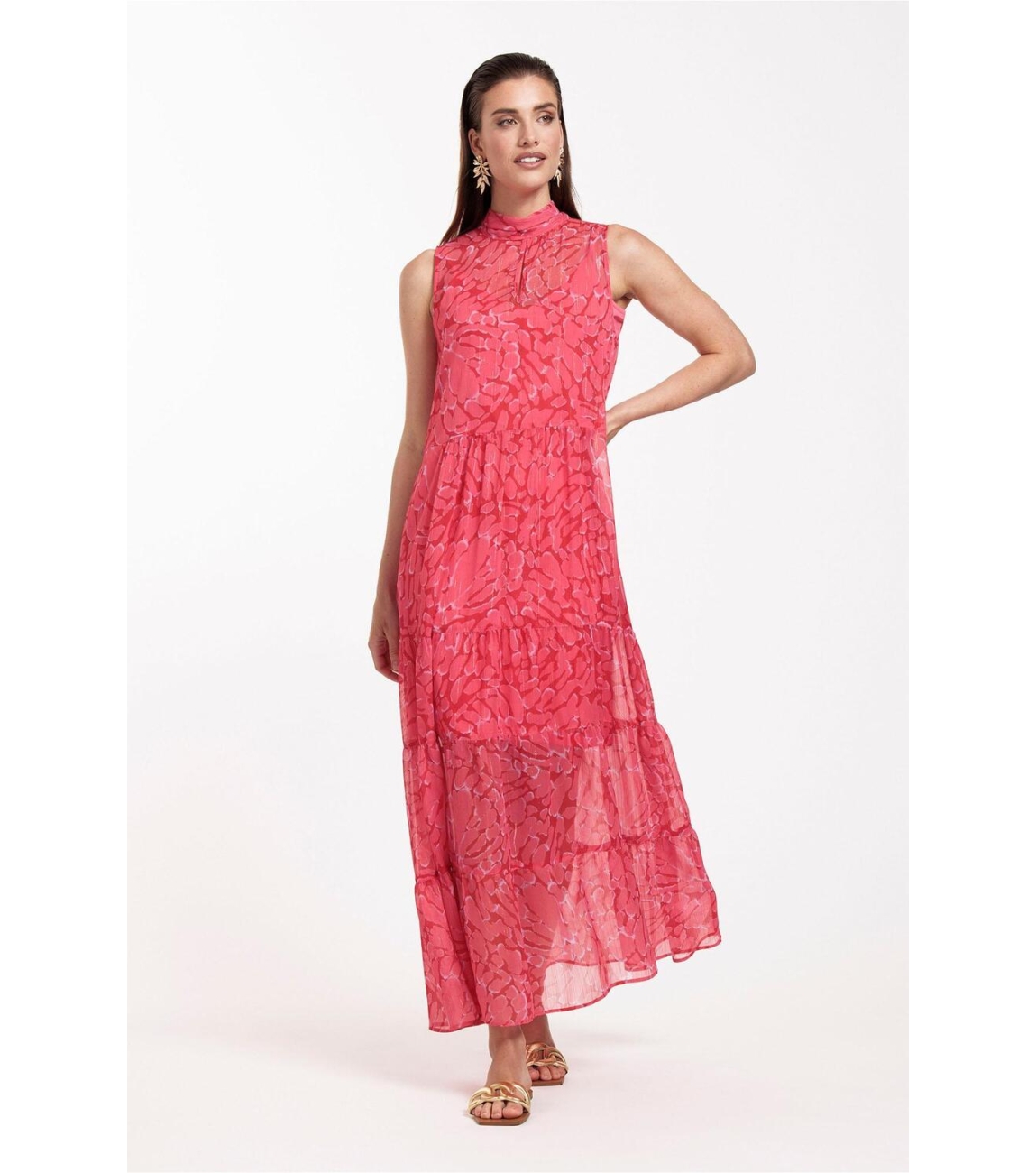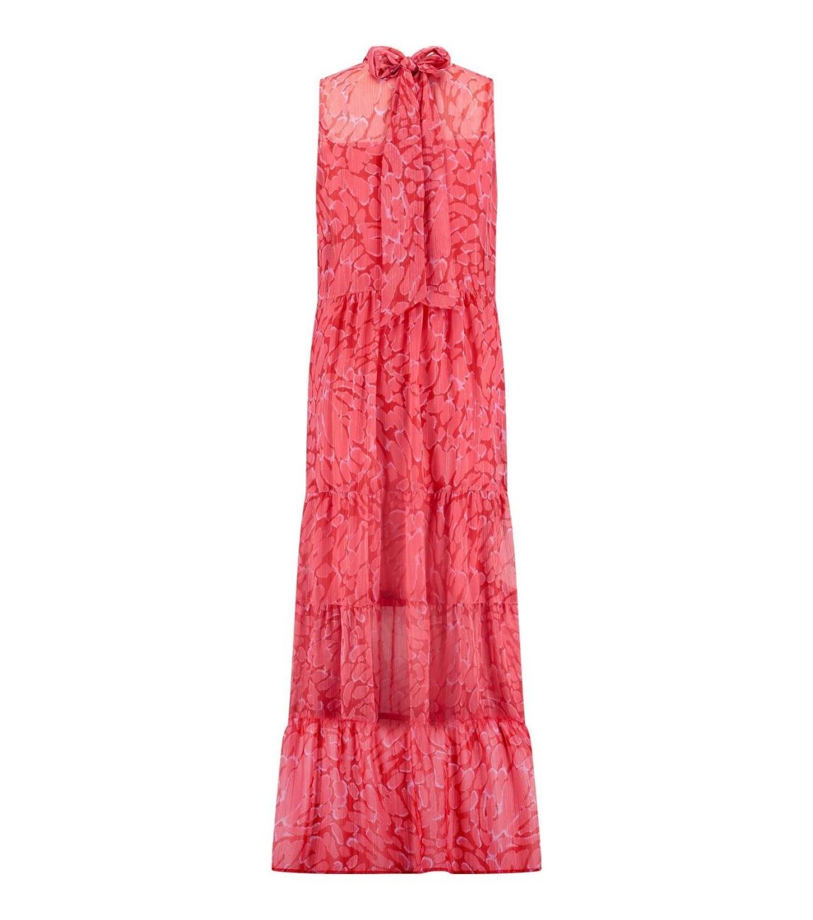 Studio Anneloes Farah jurk. Dit soepelvallende model is voorzien van een opstaande hals en is mouwloos. Deze rode jurk van Studio Anneloes sluit door middel van een knoop en strik aan de achterzijde en valt tot de enkel. Deze maxi dress is bewerkt met een all-over gevlekte print voorzien van een lurex draad. Dit is uitgevoerd met een onderjurk.