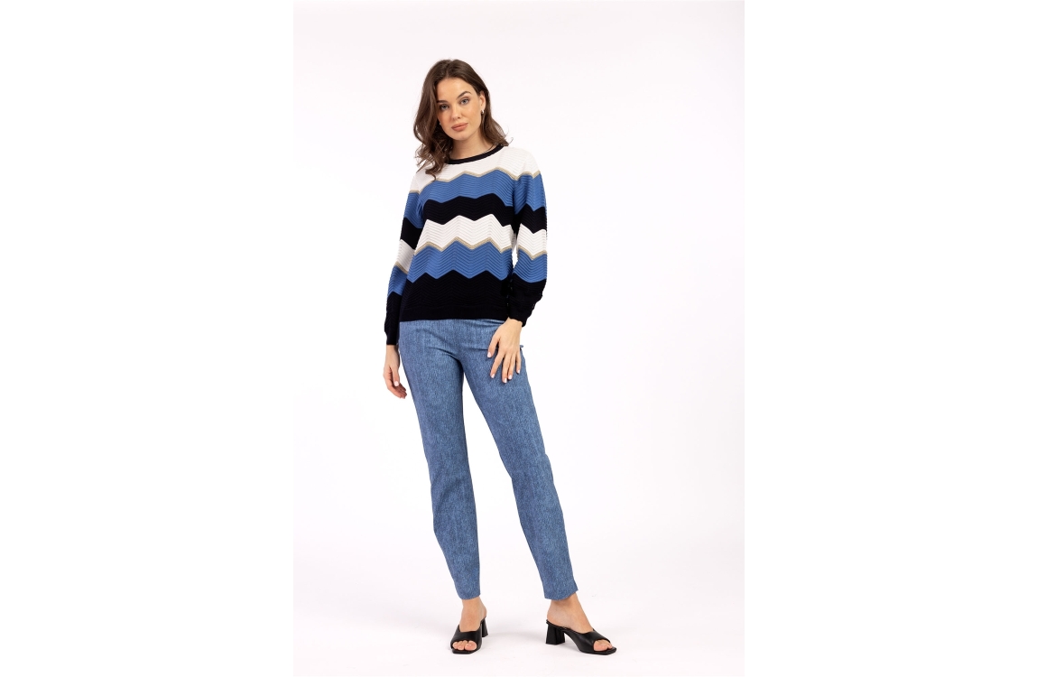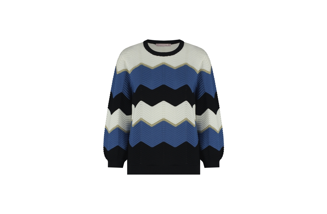 Studio Anneloes isa zigzag ajour pullover 09859. Dit soepelvallende model heeft een ronde hals en lange mouwen. Deze blauw/zwart/witte pullover van Studio Anneloes is bewerkt met een zig zag patroon en gouden accenten.