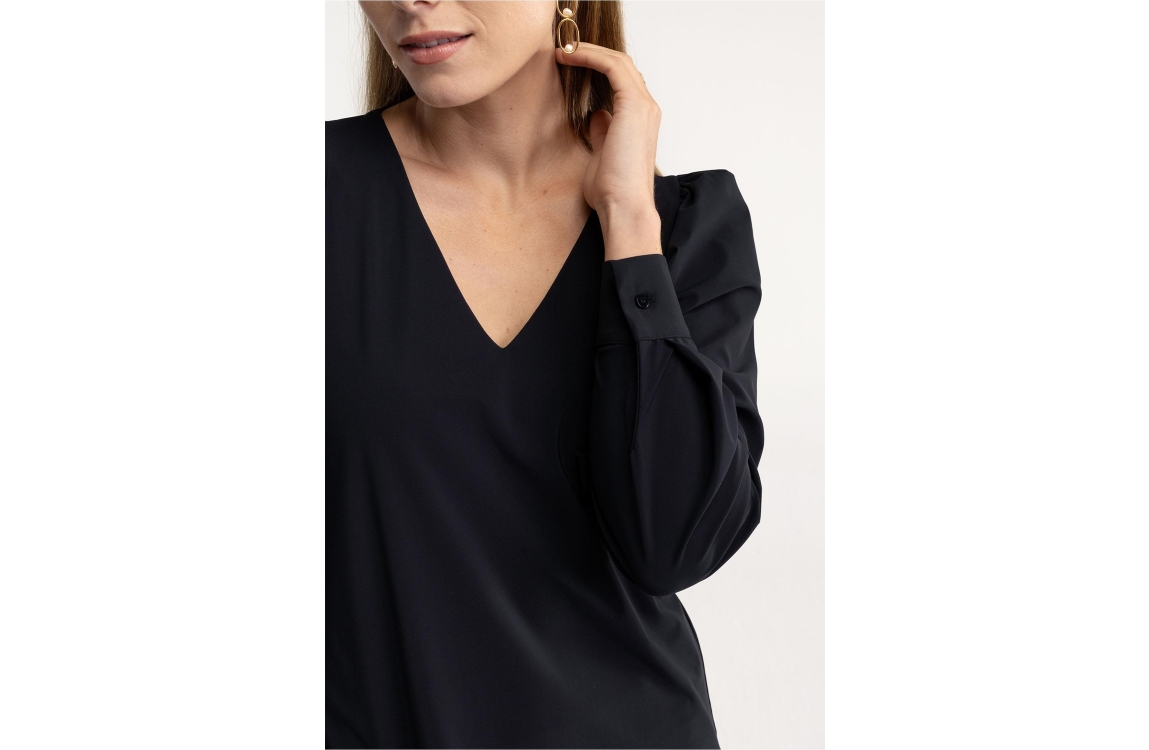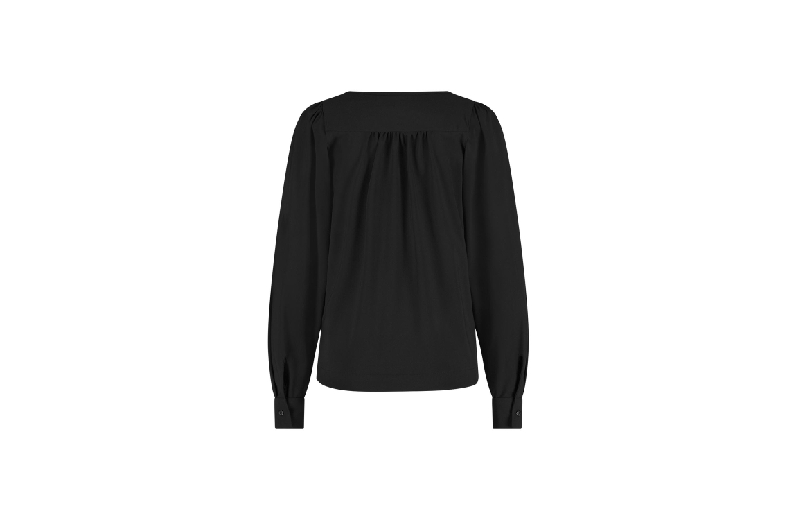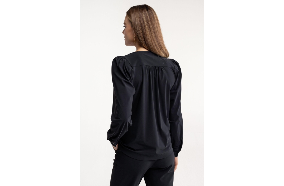Studio Anneloes top Les 94821. Dit rechtvallend model is voorzien van een v-hals en heeft lange pofmouwen. Deze zwarte top van Studio Anneloes is uitgevoerd in een travel kwaliteit.