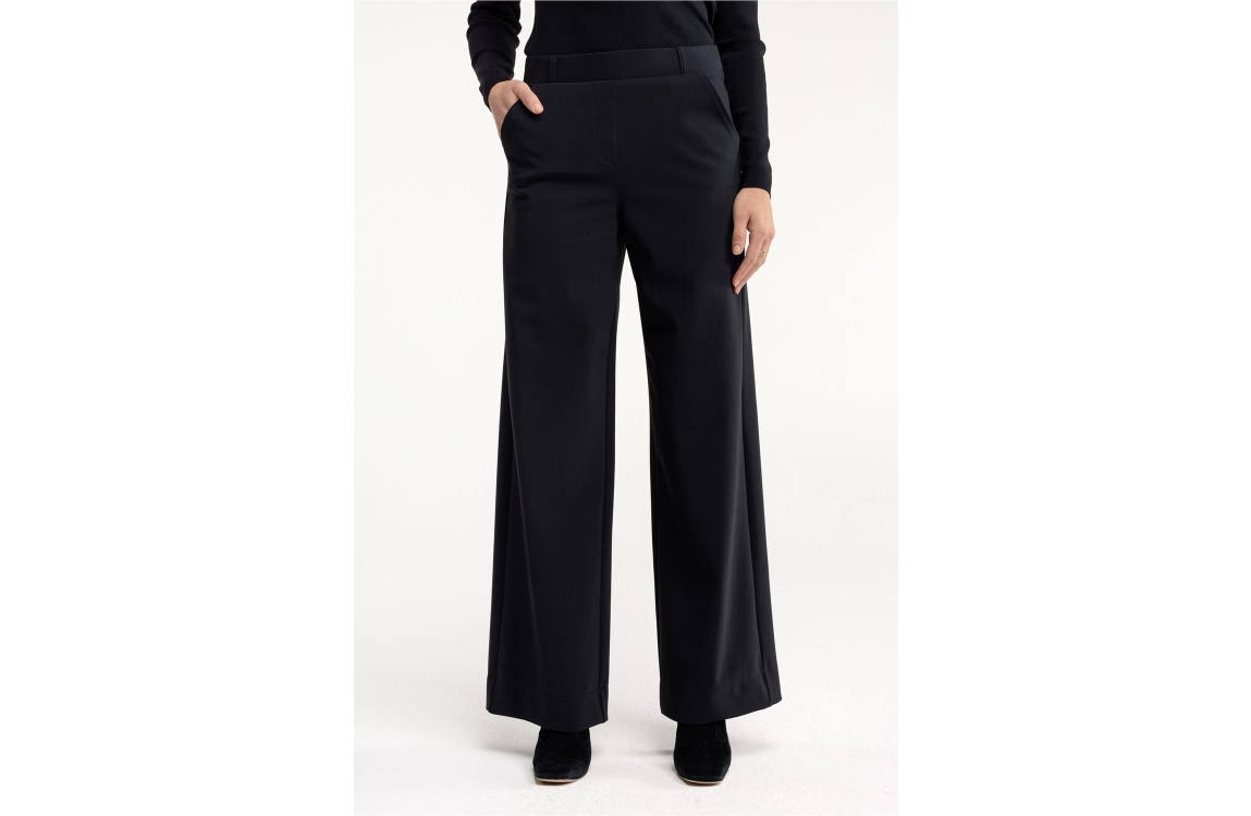 Studio Anneloes Lexie bonded trousers 94801. Dit wide fit model sluit aan de bovenzijde door middel van een elastische tailleband met riemlusjes. Deze zwarte broek van Studio Anneloes is voorzien van steekzakken, fake paspelzakken achter en heeft een brede zoom.