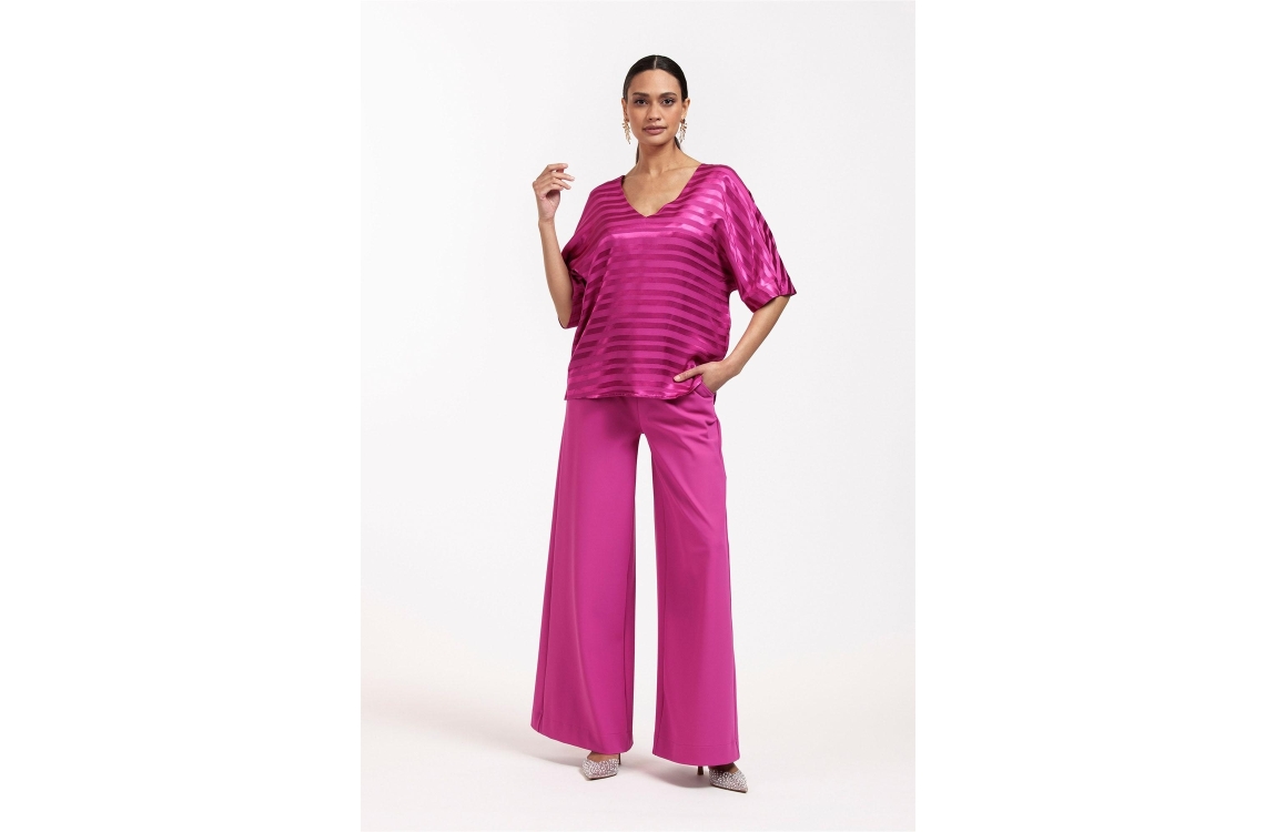 Studio Anneloes broek liv 11109. Dit wijdvallende model is voorzien van een elastische tailleband en heeft lange pijpen. Deze fuchsia kleurige broek van Studio Anneloes is voorzien van twee schuine steekzakken aan de voorzijde en twee paspelzakken aan de achterzijde. Dit model is uitgevoerd in een travel kwaliteit.
