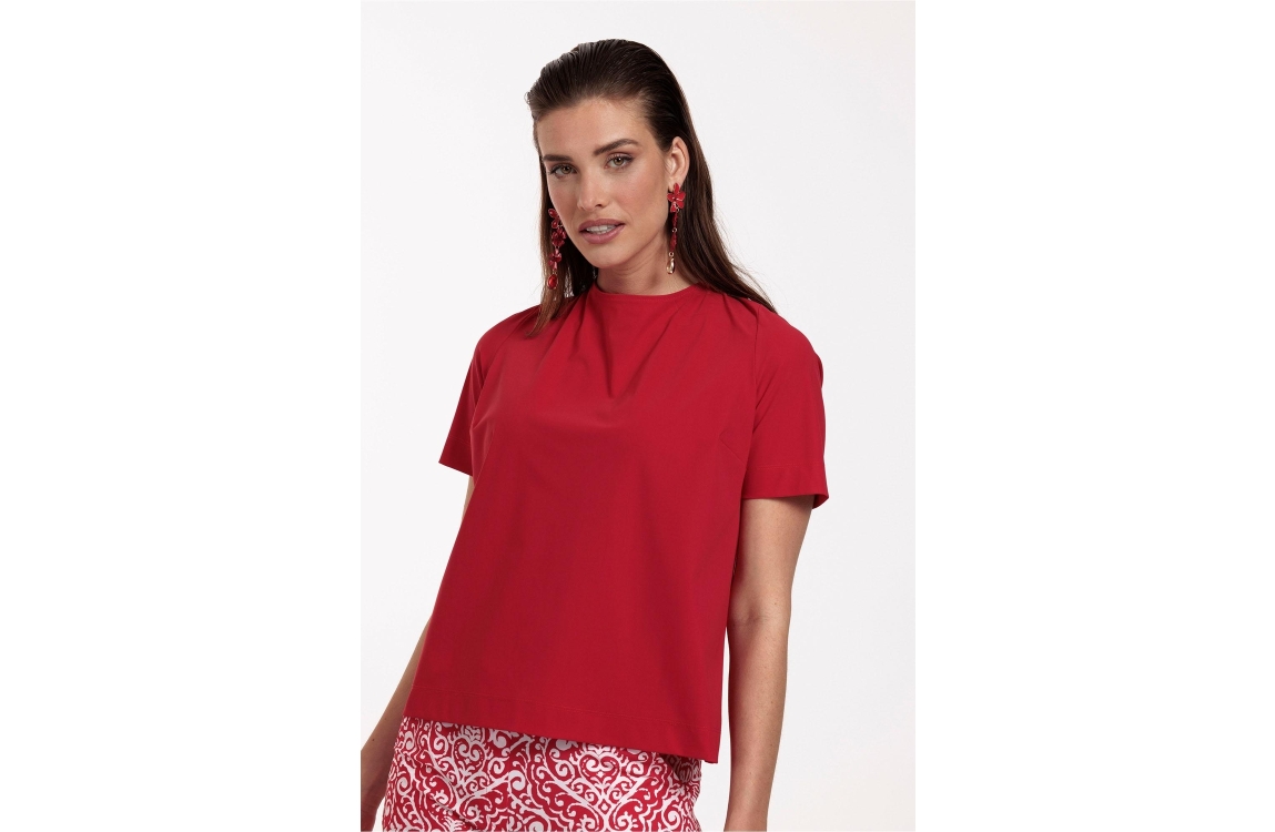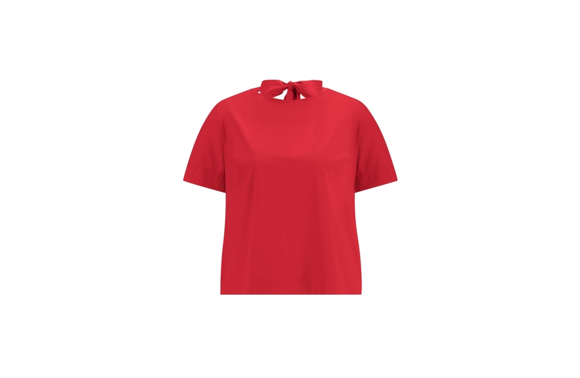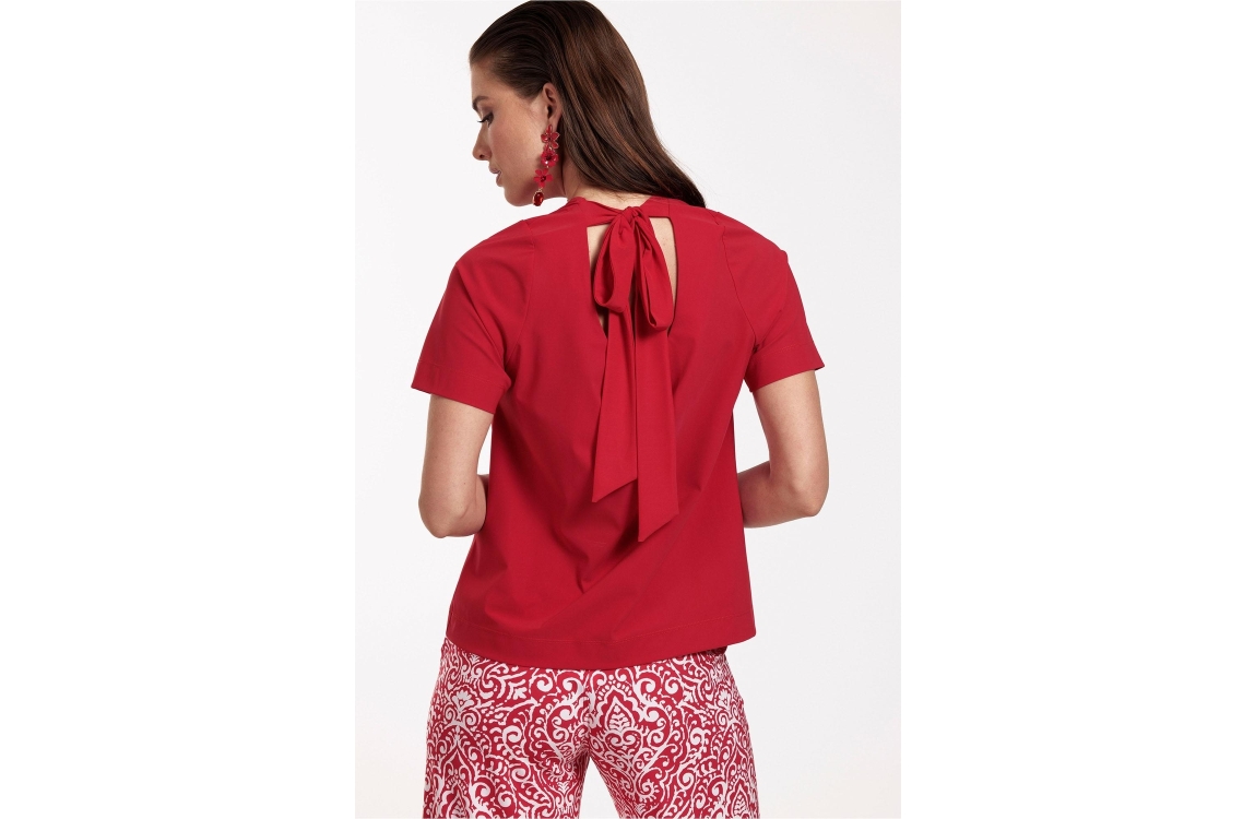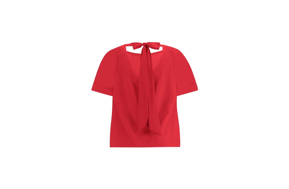 Studio Anneloes Minnen bow top. Dit rechtvallende model is voorzien van een ronde hals heeft korte mouwen. Deze rode top van Studio Anneloes is voorzien van een v-hals en strik achterzijde. Dit model is uitgevoerd in een travel kwaliteit.
