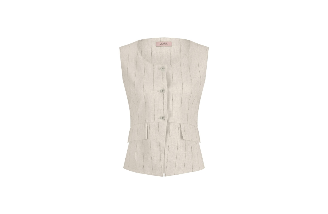 Studio Anneloes rebekka pinstripe gilet 126841490030. Dit rechtvallend model heeft een ronde hals en is mouwloos. Deze beige top van Studio Anneloes heefy zwarte strepen met klepzakken aan de voorzijde. Dit model sluit door knopen.
