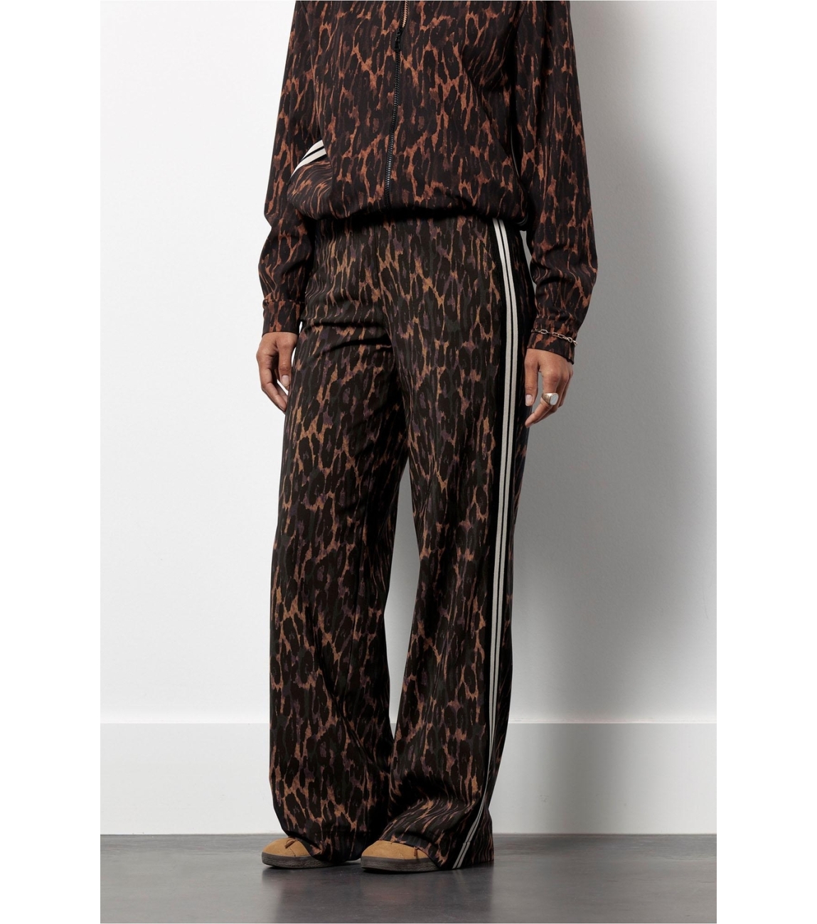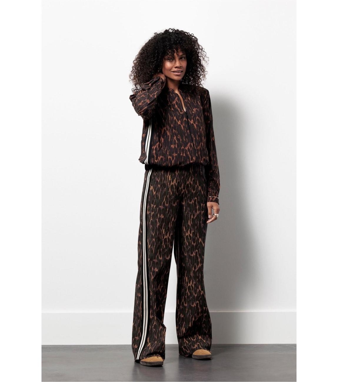 Studio Anneloes breok Trainer 13252. Dit wide leg model sluit door middel van een elastische boord en beschikt over twee steek- en paspelzakken. Deze bruine broek van Studio Anneloes is all-over bewerkt met een panterprint en is afgewerkt met zwart/witte biezen aan de zijkanten.