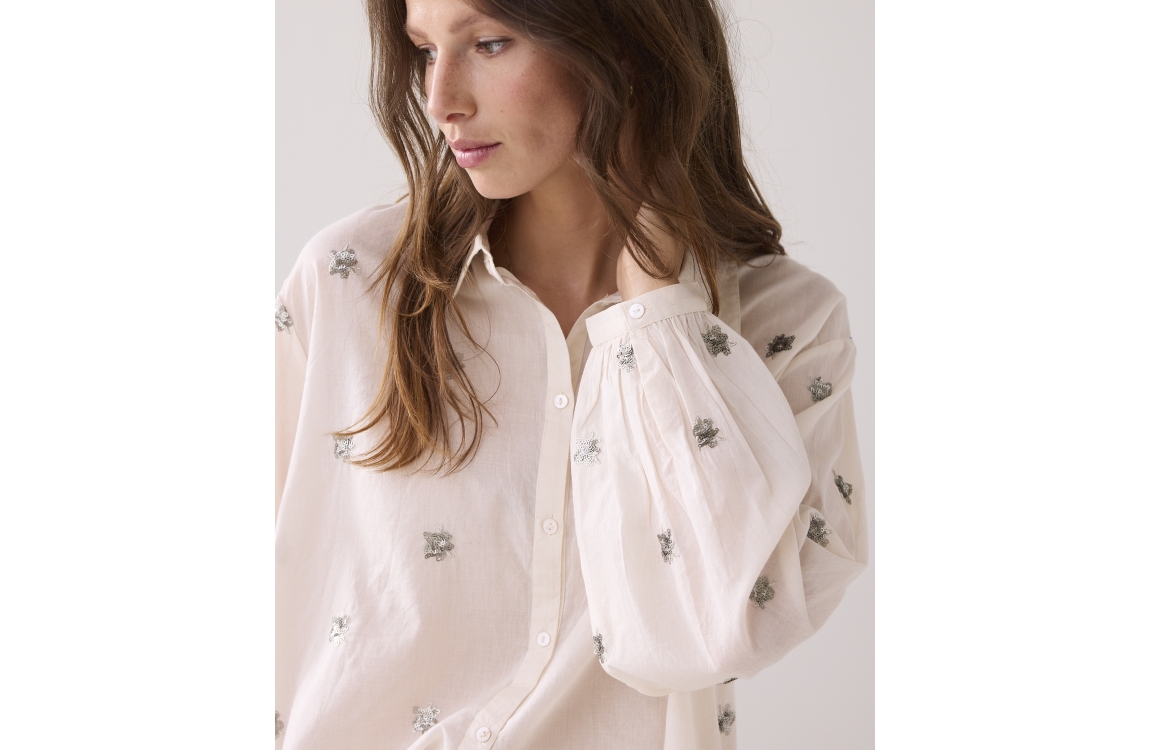 Summum Woman blouse 2s3328-12012. Dit rechtvallend model is voorzien van een kraag en heeft lange mouwen. Deze crémekleurige blouse van Summum Woman sluit door middel van knopen en is bewerkt met een paillettenpatroon.