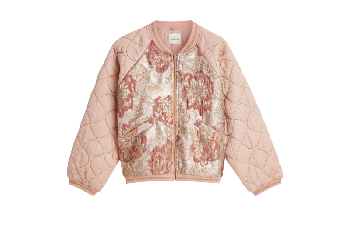 Summum Woman Jacket Rose jacquard mix 570 Faded rose. Dit bomber model heeft een lage opstaande kraag en lange mouwen. Het roze jasje sluit aan de voorzijde door middel van een rits en is voorzien van twee steekzakken. Het model heeft matte satijnen mouwen, ribboorden met een fijne lurexstreep en is op de body bewerkt met jacquard materiaal.