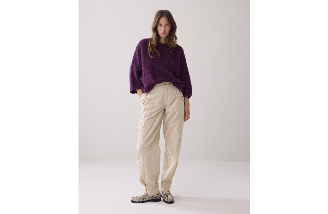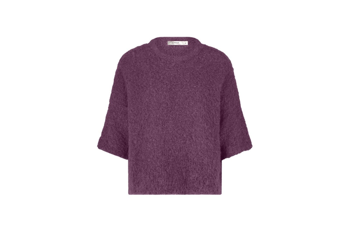 Summum Woman sweater 7s7925-70030. Dit wijdvallend model is voorzien van een ronde hals en heeft korte mouwen. Deze aubergine kleurige sweater van Summum is uitgevoerd in een bouclé kwaliteit.