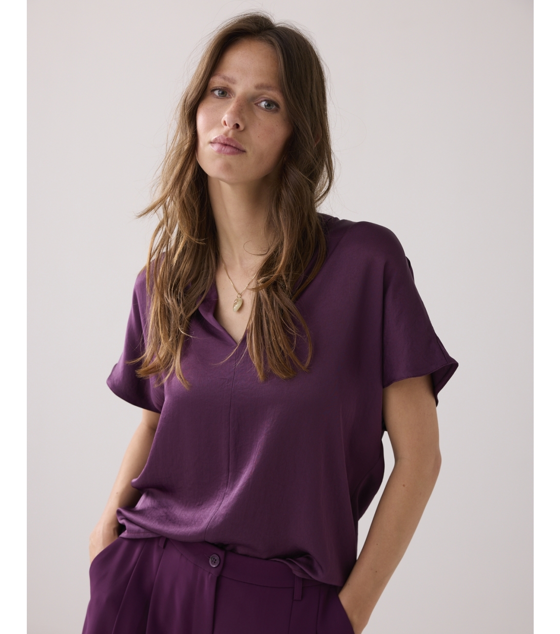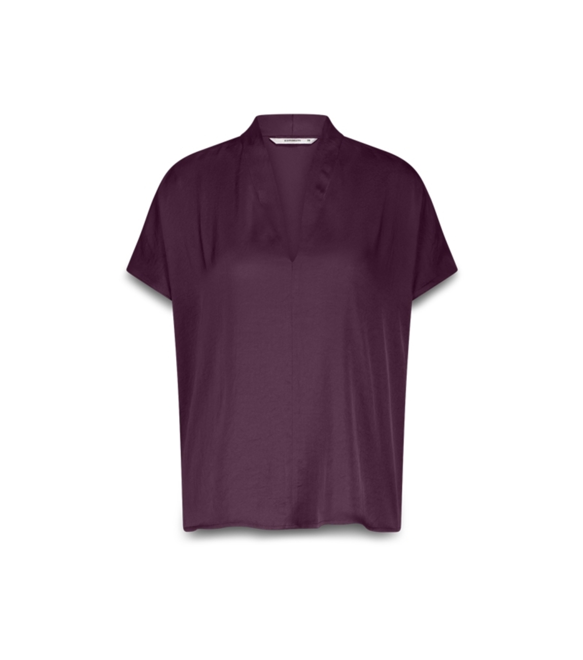 Summum Woman top 2s3324-11817. Dit rechtvallend model is voorzien van een ronde hals met v-inkeping en heeft korte mouwen. Deze aubergine kleurige top van Summum Woman is uitgevoerd in een glanzende kwaliteit.