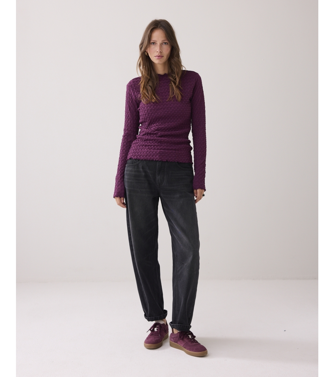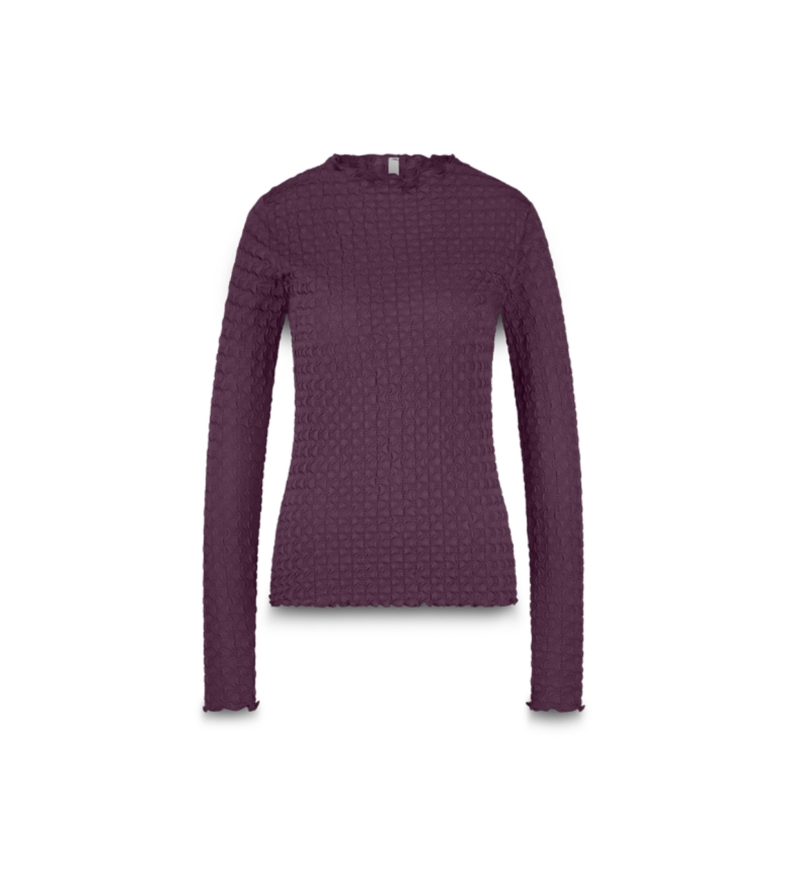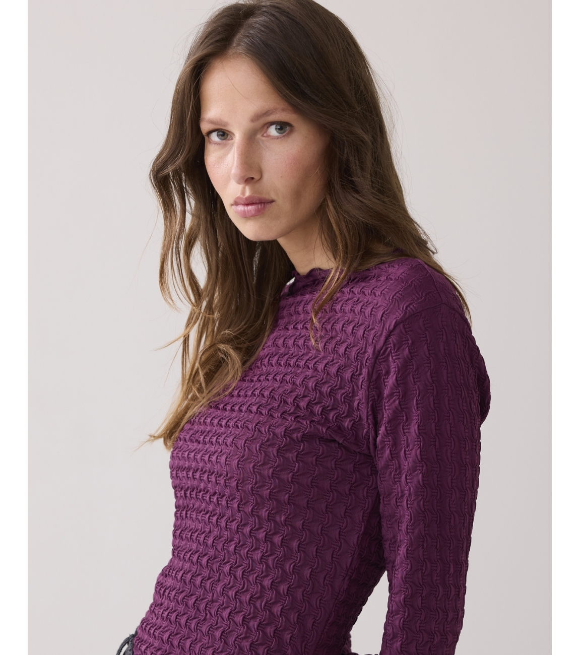 Summum Woman top 3s5166-30721. Dit rechtvallend model is voorzien van een hoge ronde hals en heeft lange mouwen. Deze aubergine kleurige top van Summum Woman is uitgevoerd in een structuur.
