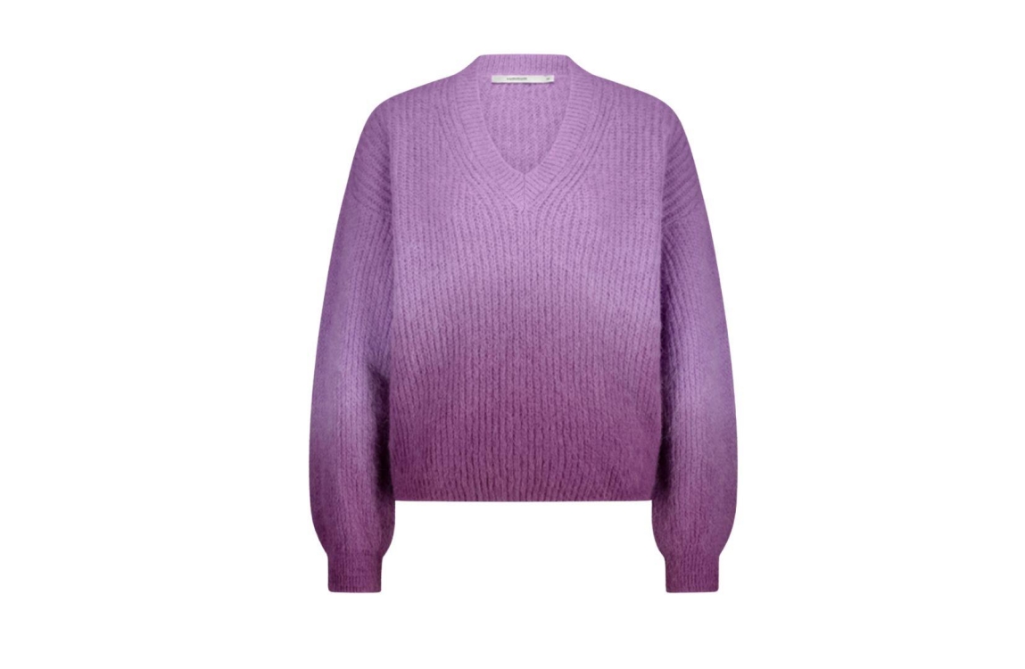 Summum Woman trui 7s7936-70037. Dit rechtvallend model is voorzien van een v-hals en heeft lange mouwen. Deze paarse trui van Summum Woman is bewerkt met dipdye aan de onderzijde en is gebreid uitgevoerd.