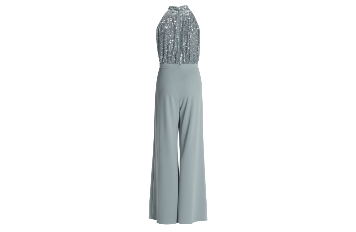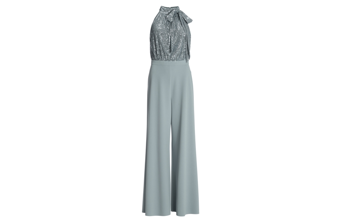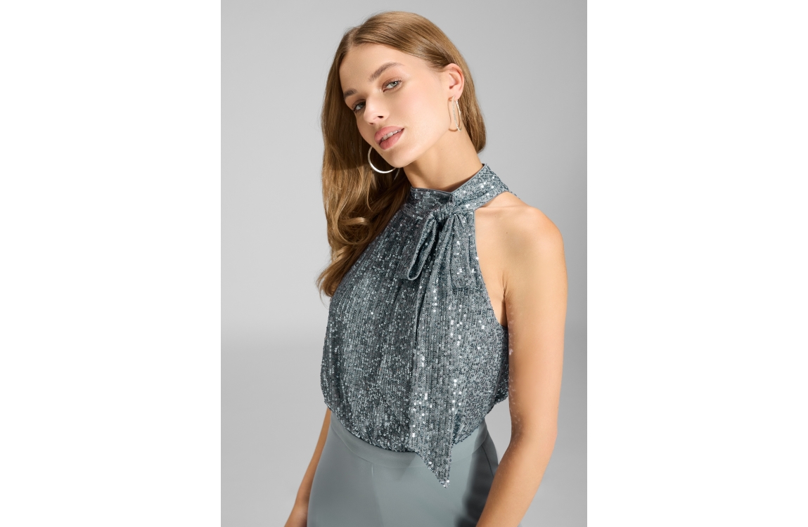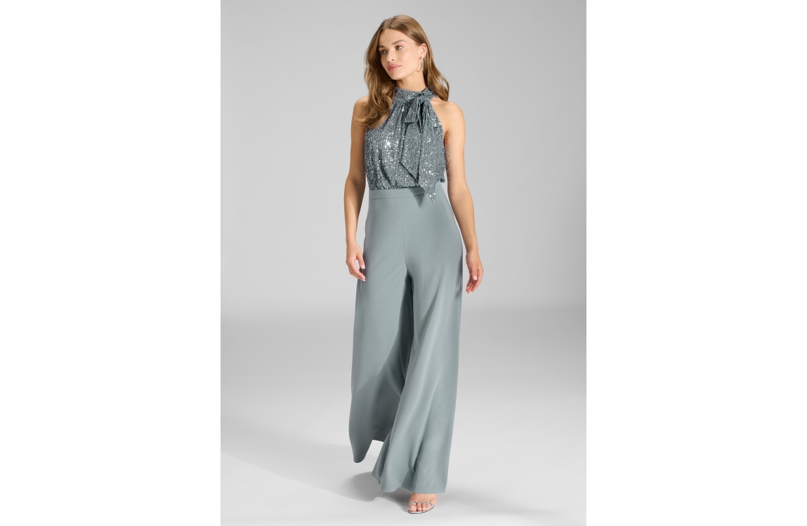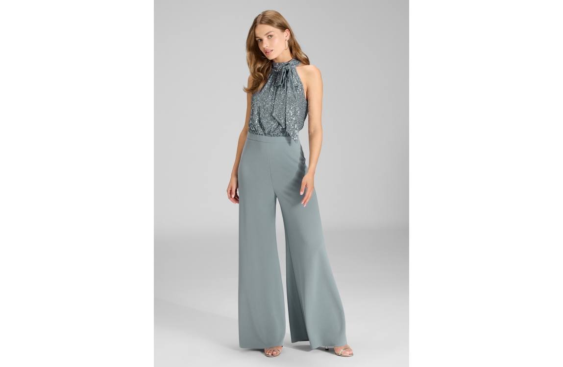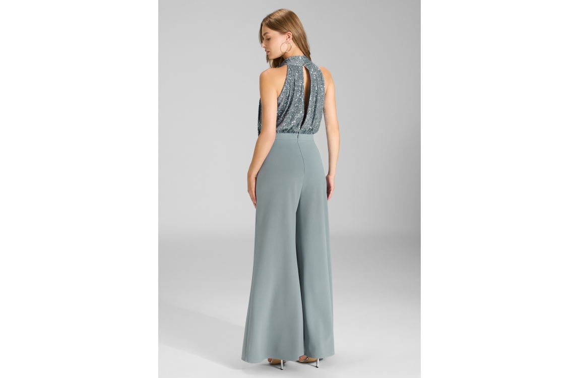 Swing jumpsuit 3AH03900. Dit rechtvallend model heeft een ronde hals met strik, is mouwloos en sluit door middel van een blinde rits. Deze blauwe jumpsuit van Swing is voorzien van een open rug, pailletten bovenzijde en stretchy onderkant.