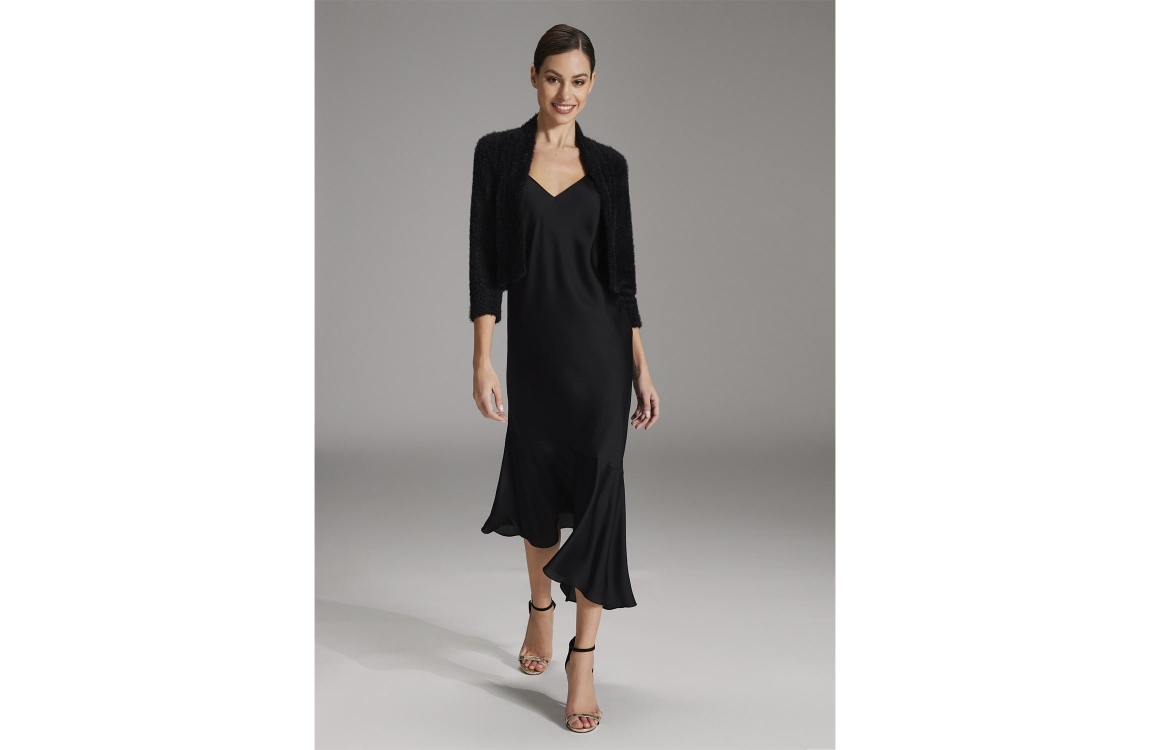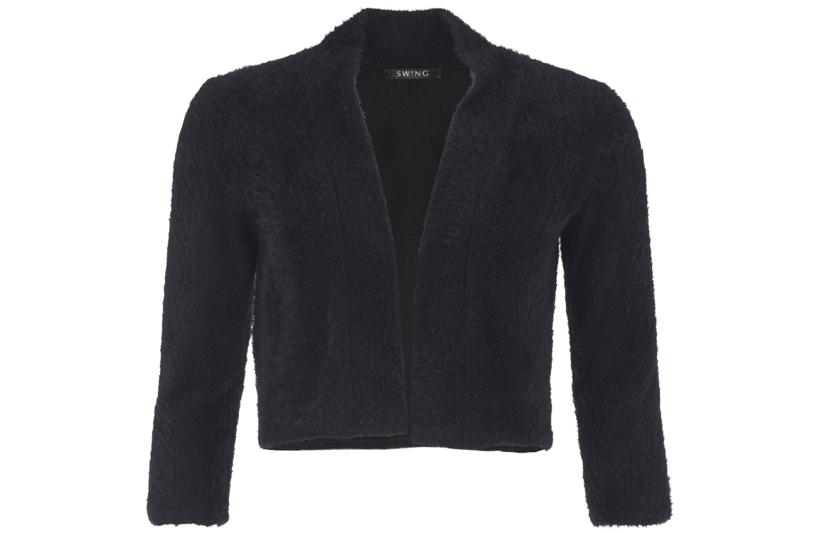 Swing bolero 1AH010. Dit openvallend model is voorzien van een ronde hals en heeft driekwart mouwen. Deze zwarte bolero van Swing is zacht uitgevoerd.
