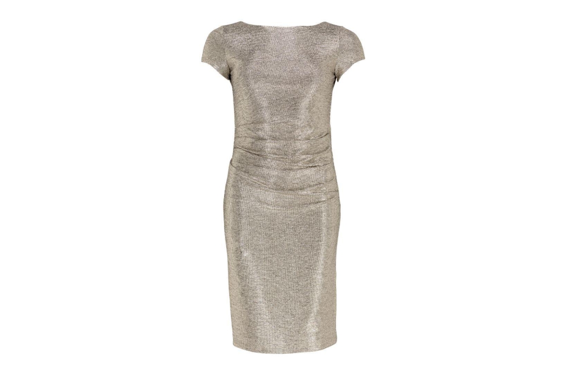Swing jurk 777614. Dit aangesloten model is voorzien van een ronde hals en heeft korte mouwen. Deze goudkleurige jurk van Swing sluit aan de achterzijde door middel van een blinde rits en is aan de voorzijde bewerkt met gedrapeerde details.