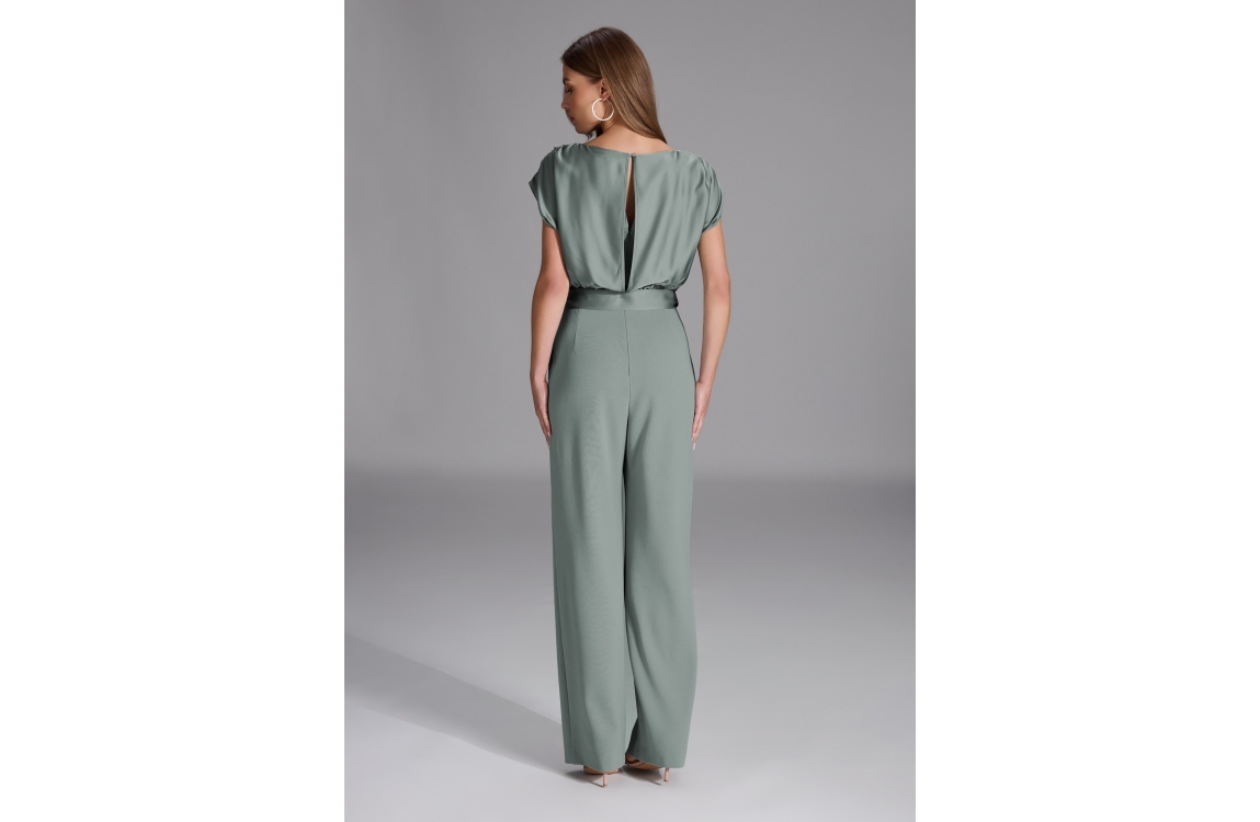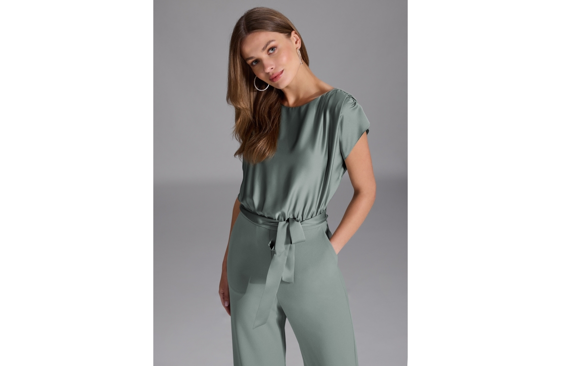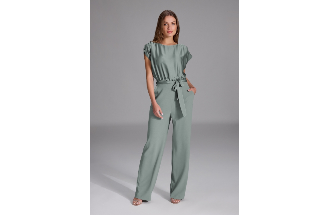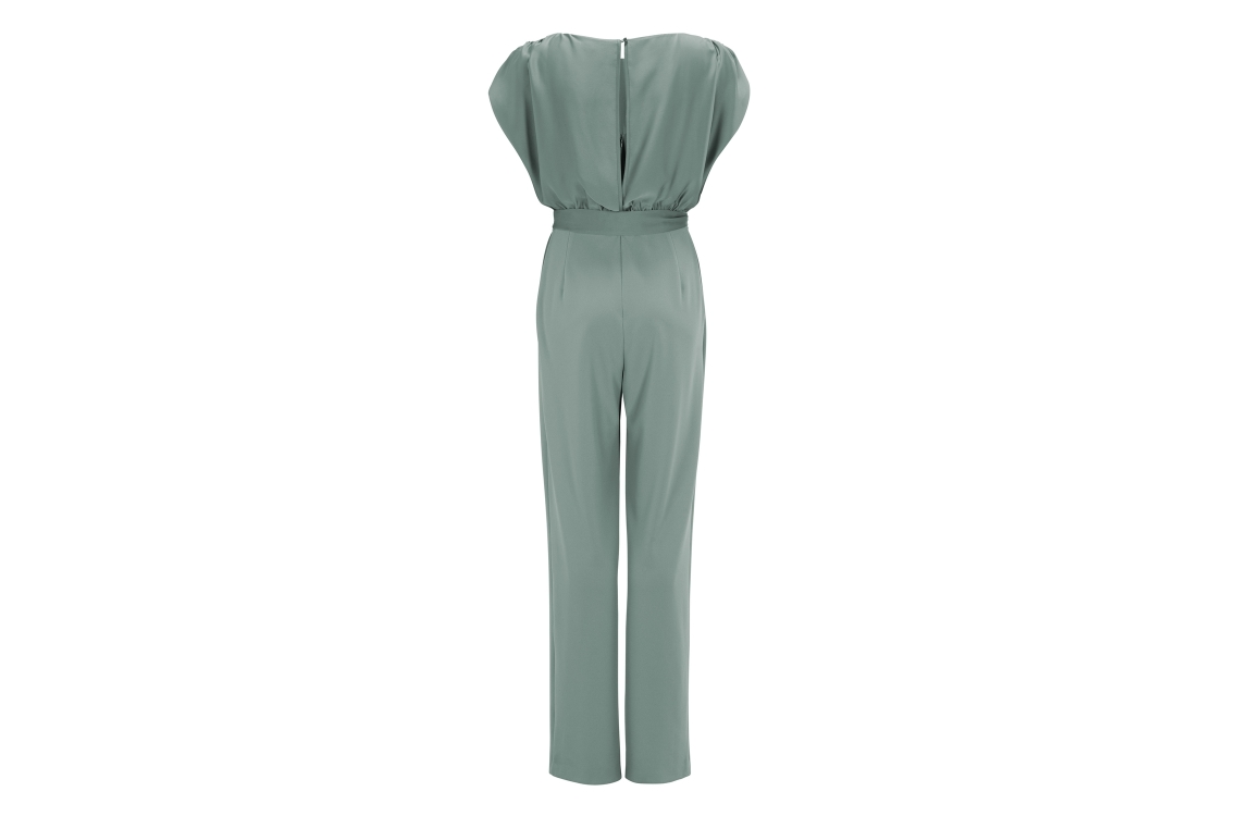 Swing Jumpsuit 3AD00400. Dit regular fit model heeft een ronde halslijn met plooidetails en korte mouwen. Deze groene jumpsuit van Swing sluit aan de achterzijde door middel van een knoop- en ritssluiting en is voorzien van een strikceintuur op de taille. Het model is uitgevoerd in een satijnen-look aan de bovenzijde en is afgewerkt met een open rug. Deze jumpsuit beschikt over twee schuine steekzakken.