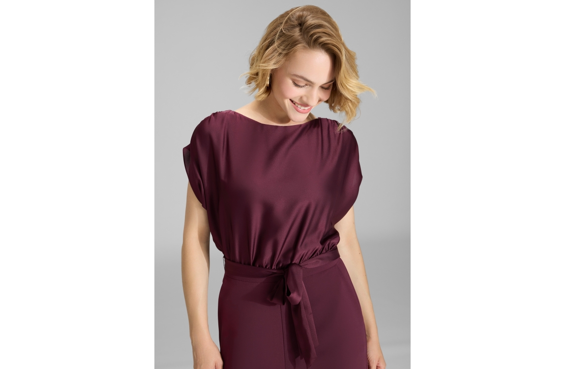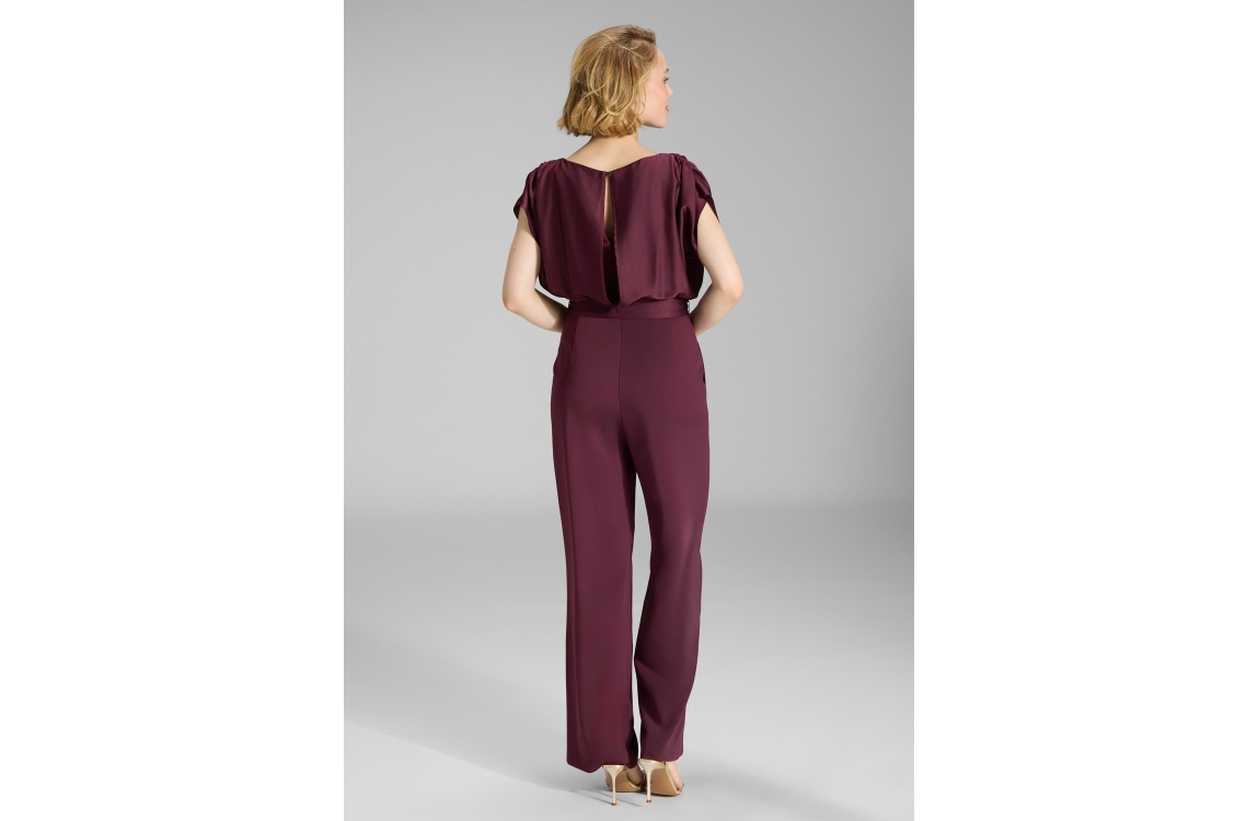 Swing Jumpsuit 3AD00400. Dit rechtvallend model heeft een ronde hals, korte mouwen en sluit door middel van een rits en strikkoord. Deze rode jumpsuit van Swing is voorzien van een satijnen bovenzijde en is afgewerkt met een open rug. Dit model beschikt over twee schuine steekzakken.