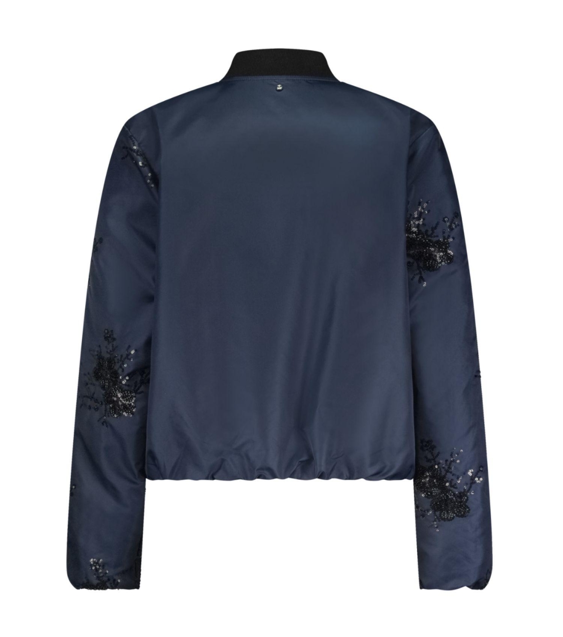 Tramontana bomber jas C23-18-801. Dit bombermodel heeft een ronde halslijn met opstaande kraag en lange mouwen. Deze donkerblauwe jas van Tramontana sluit aan de voorzijde met een ritssluiting en is op het voorpand en de mouwen gedetailleerd met pailletten en kraaltjes. Het model is voorzien van twee schuine steekzakken en een elastische zoom.