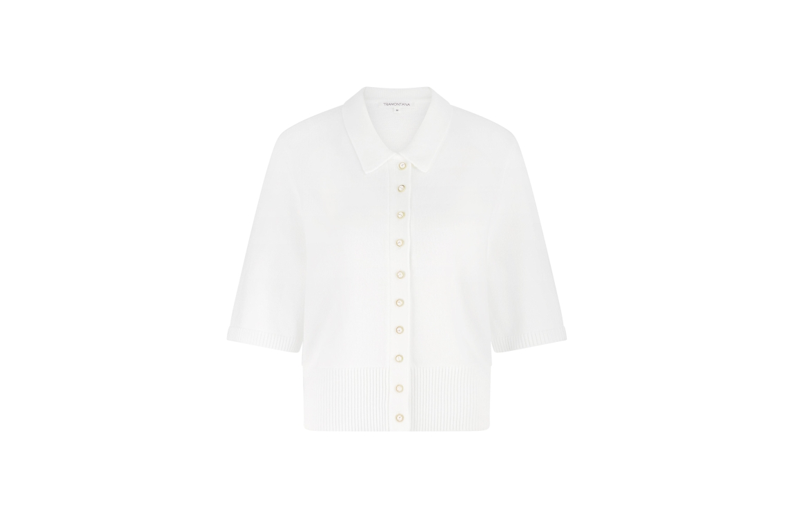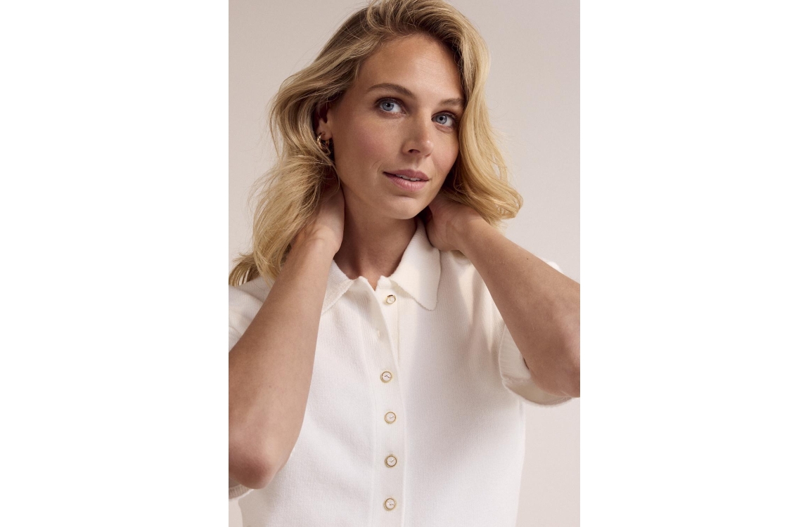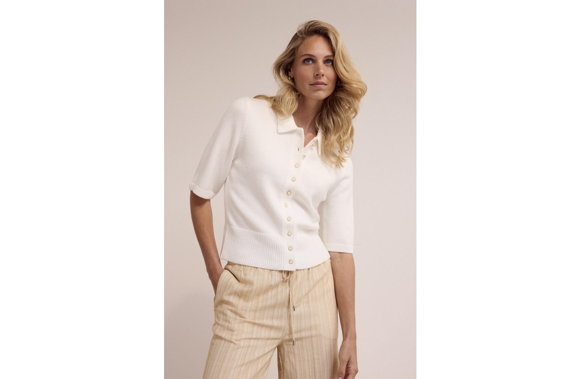 Tramontana Cardigan Y02-19-702. Dit rechtvallend model heeft een kraag, driekwart mouwen en sluit door middel van knopen. Deze off white cardigan van Tramontana is uitgevoerd in een gebreid materiaal.