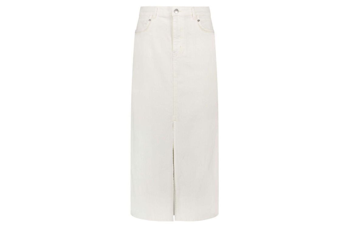 Tramontana rok B02-12-201. Dit model van Tramontana sluit door middel van een rits en een knoop en is afgewerkt met ceintuurlussen. Deze witte denim rok is voorzien van twee steekzakken aan de voor- en achterzijde en is aan de voorzijde bewerkt met een split.