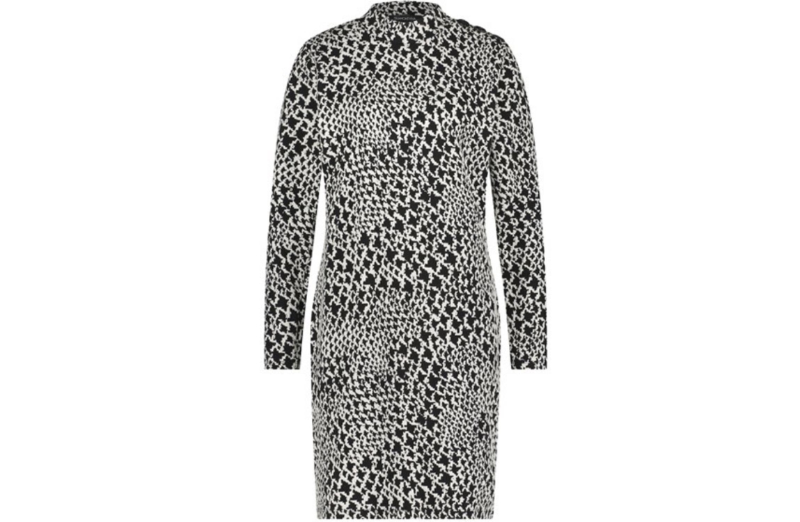 Tramontana jurk T03-10-50. Dit rechtvallende model is voorzien van een turtle hals en lange mouwen. Deze zwart/witte jurk van Tramontana is voorzien van extra brede manchetten met drie kunststof sierknopen.