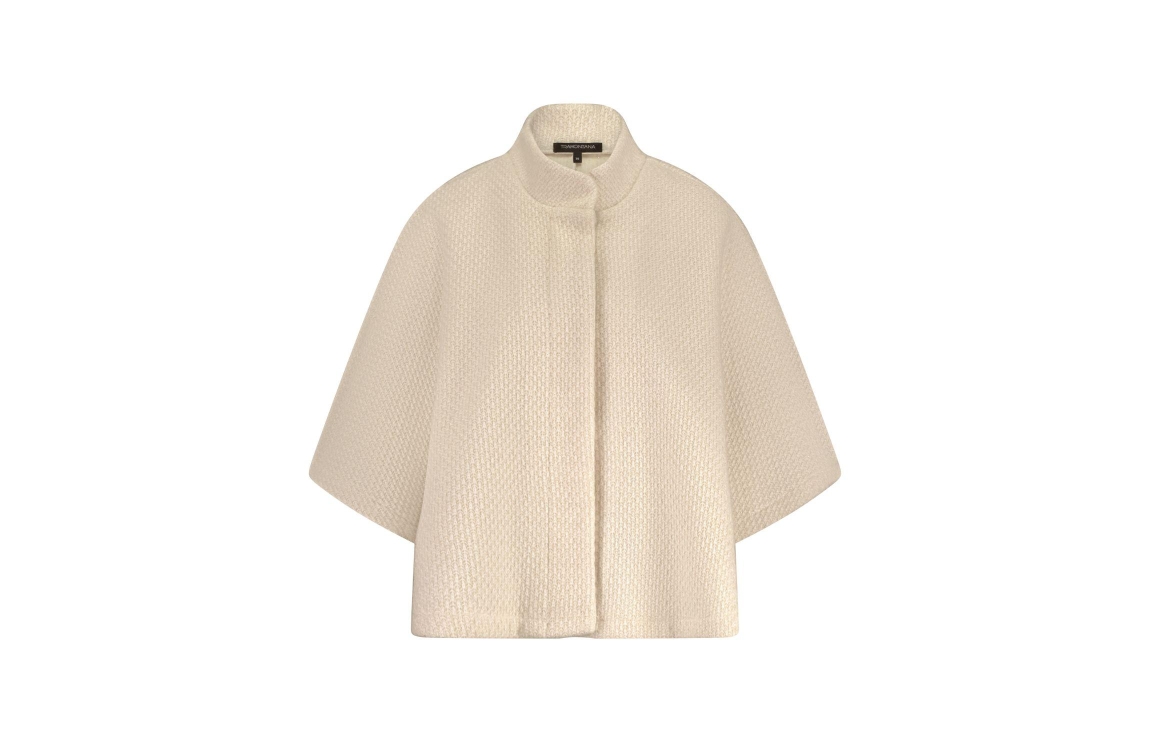 Tramontana Fancy Knitted Cape 006801 Stone melange. Dit wijdvallende model is voorzien van een opstaande kraag en driekwart mouwen. Deze beige cape van Tramontana sluit aan de voorzijde door middel van knopen. Dit model is bewerkt met een structuur.
