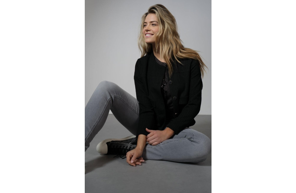 Tramontana jasje C26-13-801. Dit rechtvallend model heeft een ronde hals en lange mouwen. Deze zwarte jas van Tramontana sluit aan de voorzijde door middel van decoratieve knopen en beschikt over twee klepzakken.