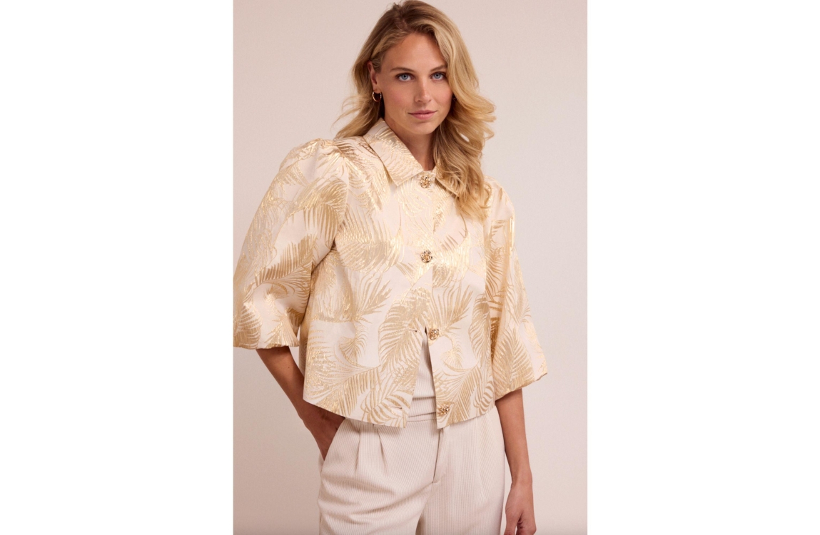 Tramontana palm jaquard jacket C39-19-801. Dit rechtvallend model is voorzien van een kraag en heeft korte pofmouwen. Deze goudkleurige jacket van Tramontana is bewerkt met een palmprint en sluit door middel van sierlijke knopen.