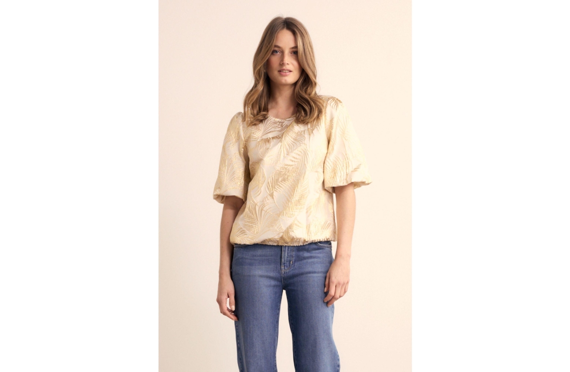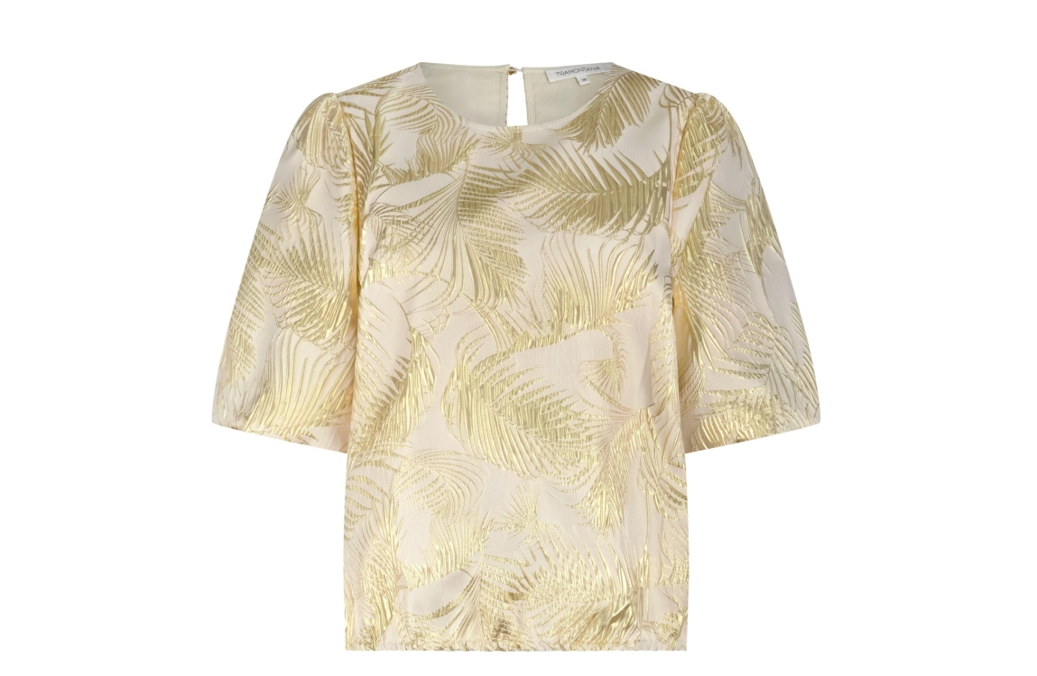 Tramontana palm jaquard top C39-19-401. Dit rechtvallend model is voorzien van een ronde hals en heeft korte pofmouwen. Deze goudkleurige top van Tramontana is bewerkt met een palmprint en sluit aan de achterzijde door middel van een knoopje.
