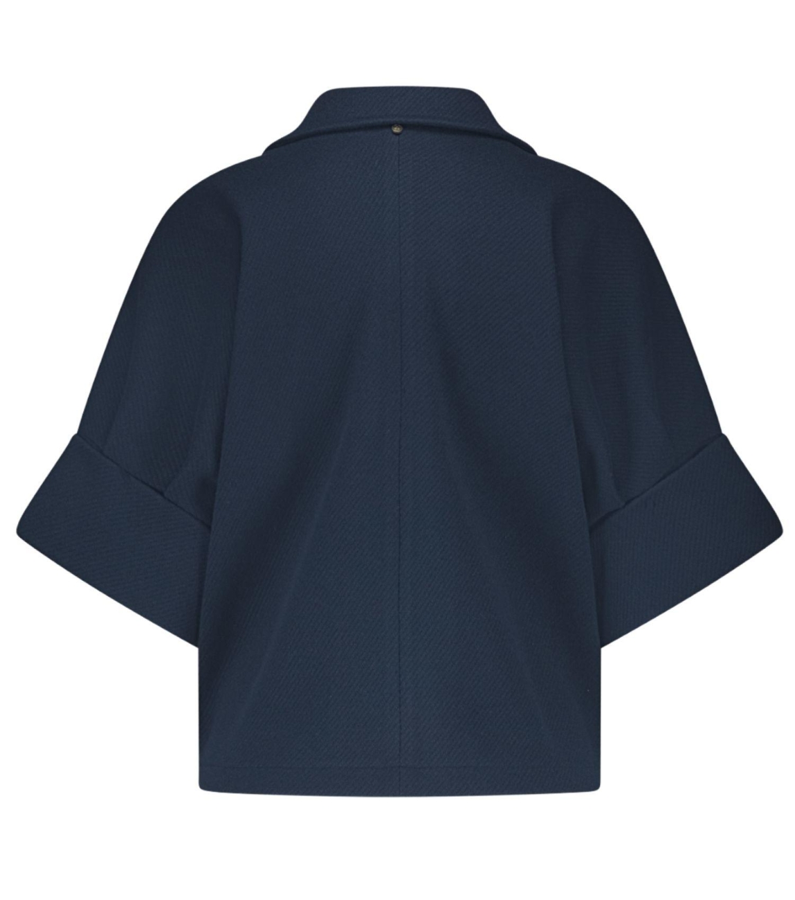 Tramontana jasje Q01-18-801. Dit soepelvallende model heeft een reverskraag en middellange mouwen. Het donkerblauwe jasje van Tramontana sluit aan de voorzijde door middel van goudkleurige knopen en is voorzien van twee schuine steekzakken.