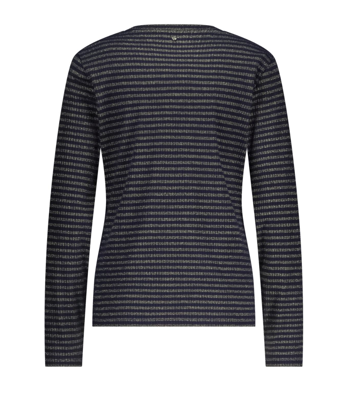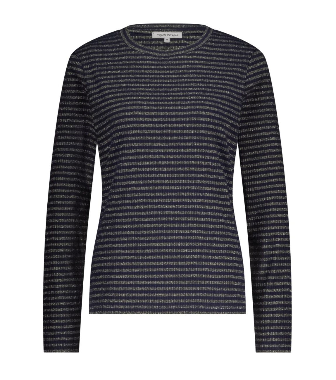 Tramontana top K02-18-401. Dit rechtvallende model heeft een ronde halslijn en lange mouwen. De donkerblauwe top van Tramontana is all-over bewerkt met een goudkleurige glitterlurex-streepprint en uitgevoerd in een ribgebreide stretchkwaliteit.