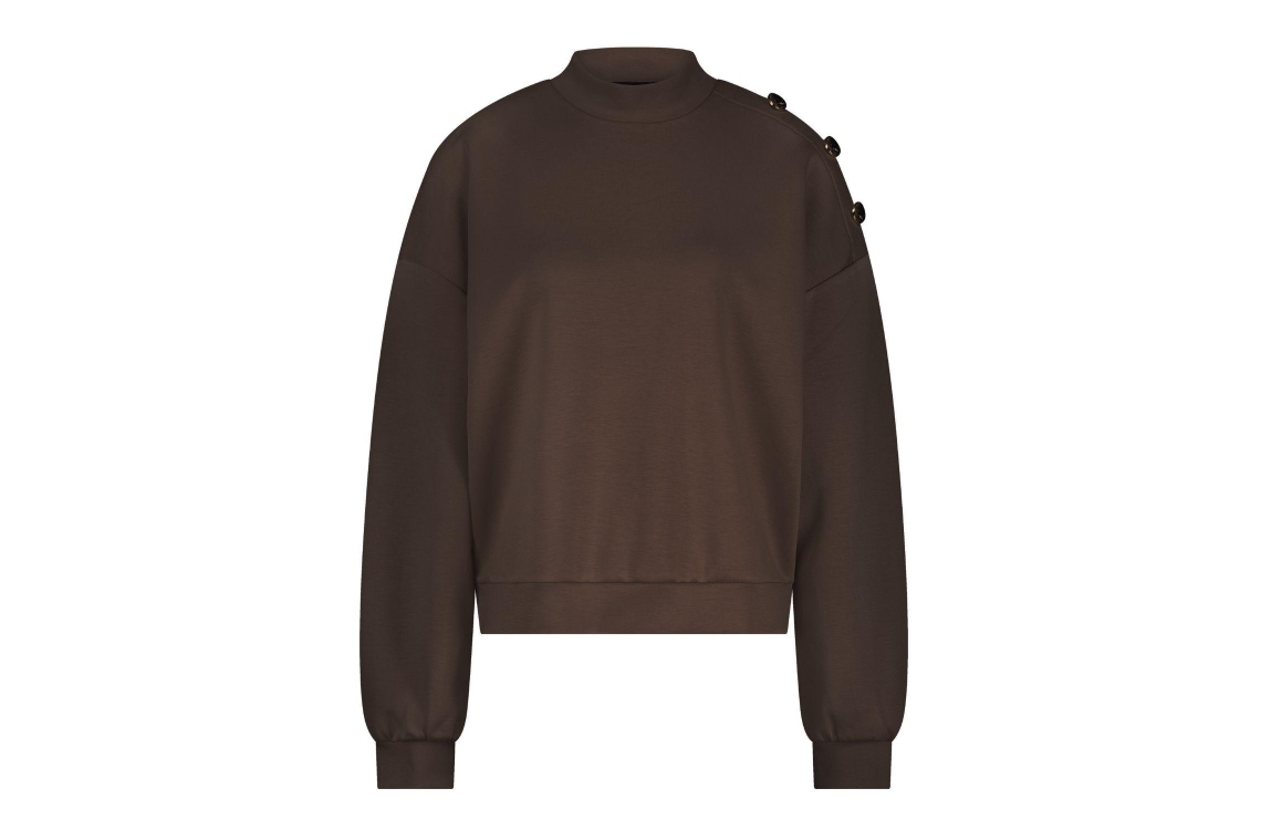 Tramontana Technical Sweat Jumper 2660 Espresso. Dit soepelvallende model heeft een ronde halslijn en lange mouwen. Deze bruine sweater van Tramontana is op de linkerschoudernaad gedetailleerd met goudkleurige knopen en is uitgevoerd in een stretchkwaliteit.