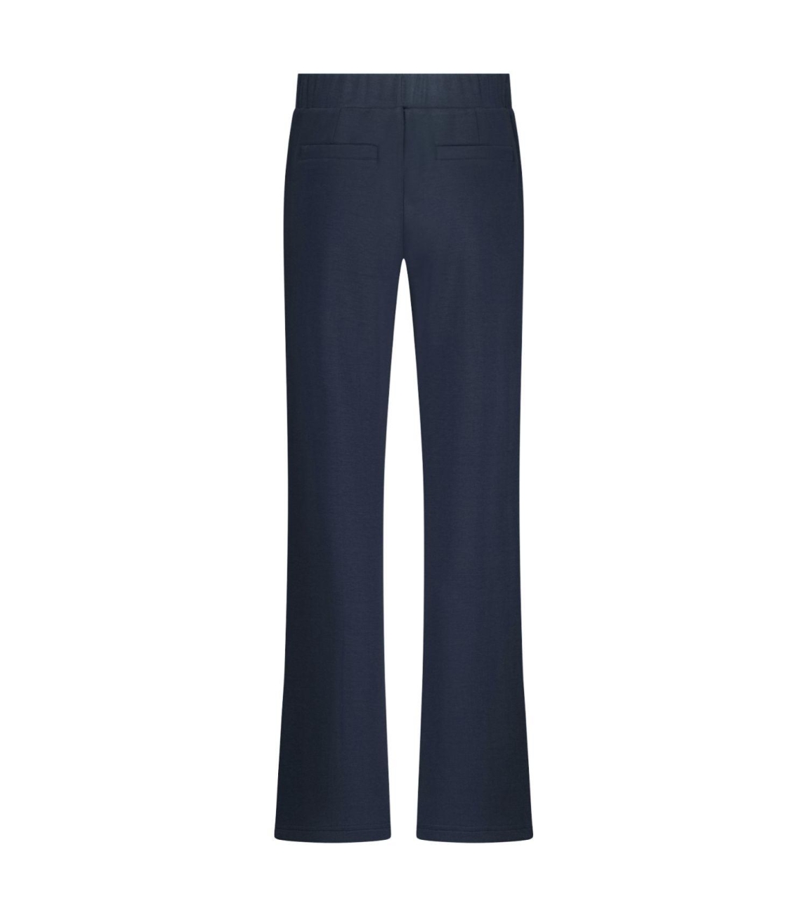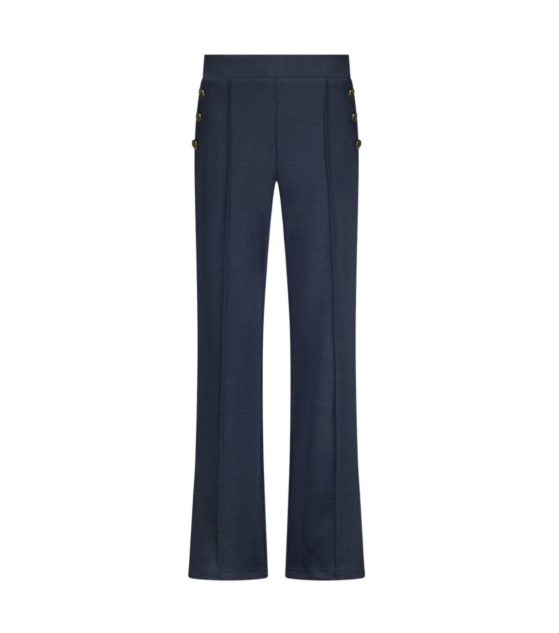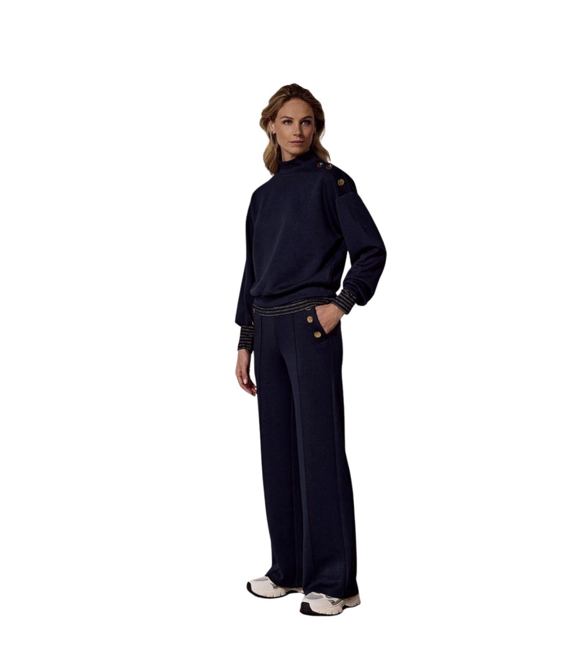 Tramontana broek C12-18-101. Dit wide leg model sluit door middel van een elastische boord. Deze donkerblauwe broek van Tramontana is voorzien van twee schuine steekzakken, gedetailleerd met goudkleurige knopen aan de voorzijde en twee paspelzakken aan de achterzijde. Het model is uitgevoerd in stretchkwaliteit.