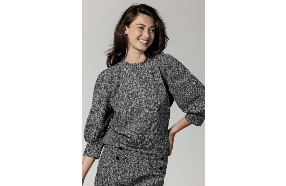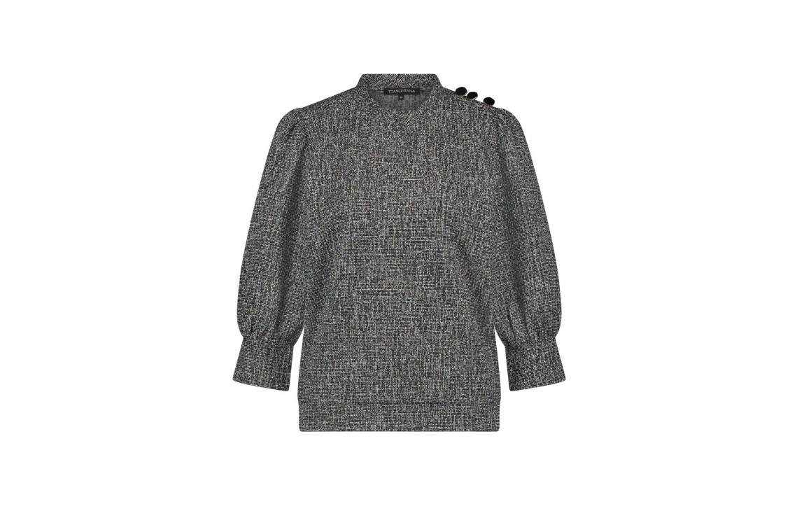 Tramontana top C-10-13-401. Dit rechtvallend model heeft een ronde hals en driekwart mouwen. Deze zwarte top van Tramontana is all-over bewerkt met een tweed stof in verschillende kleuren en is gedetailleerd met drie zwarte knopen op de linkerschouder. Dit model is uitgevoerd in lichte stretch kwaliteit en heeft elastische boorden.
