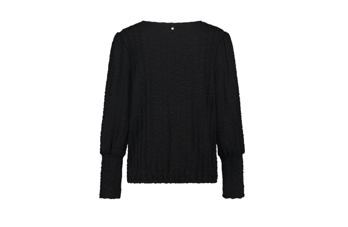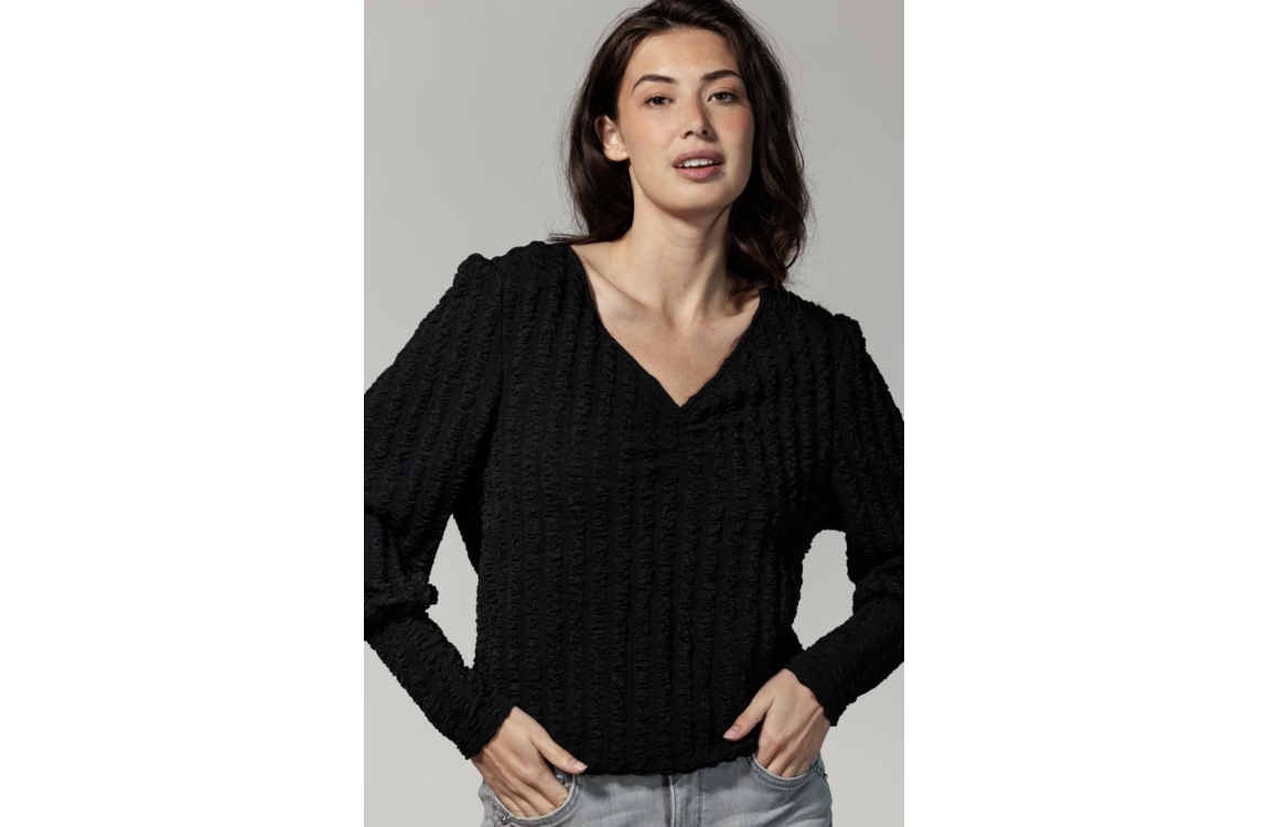 Tramontana top C24-13-401. Dit rechtvallend model heeft een V-hals en lange ballonmouwen. Deze zwarte top van Tramontana is all-over bewerkt met een streepstructuur en beschikt over een elastische onderboord.