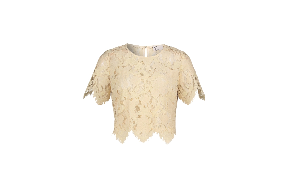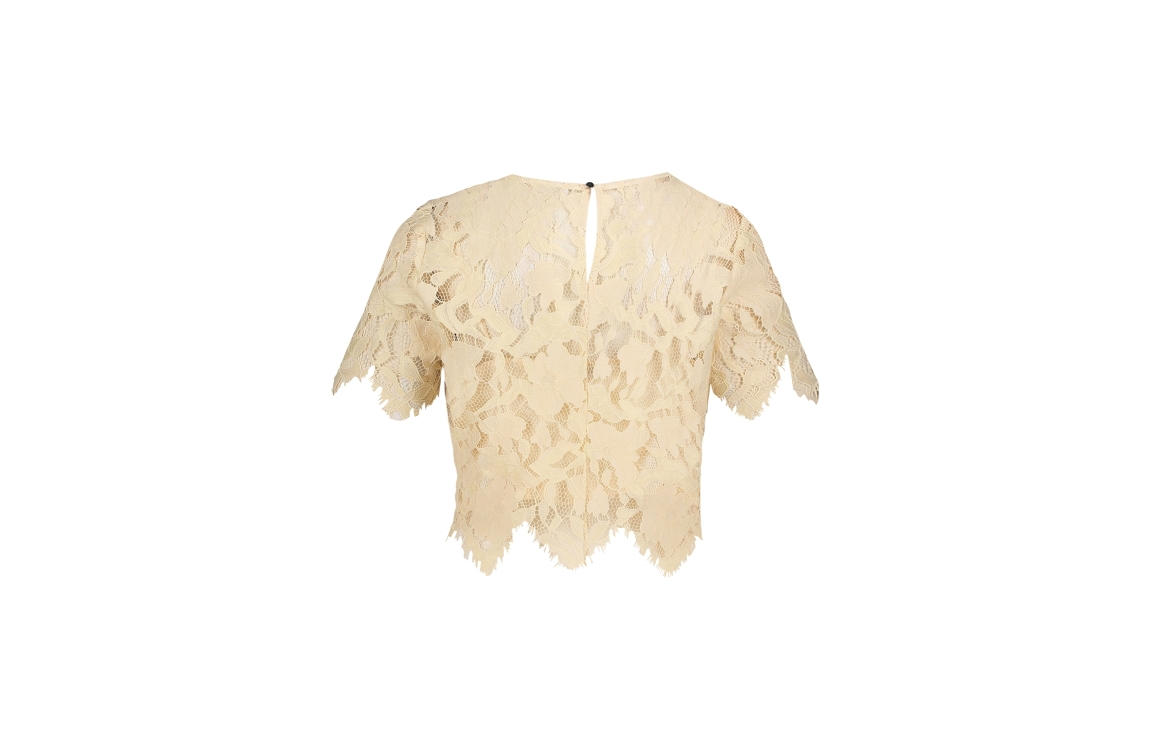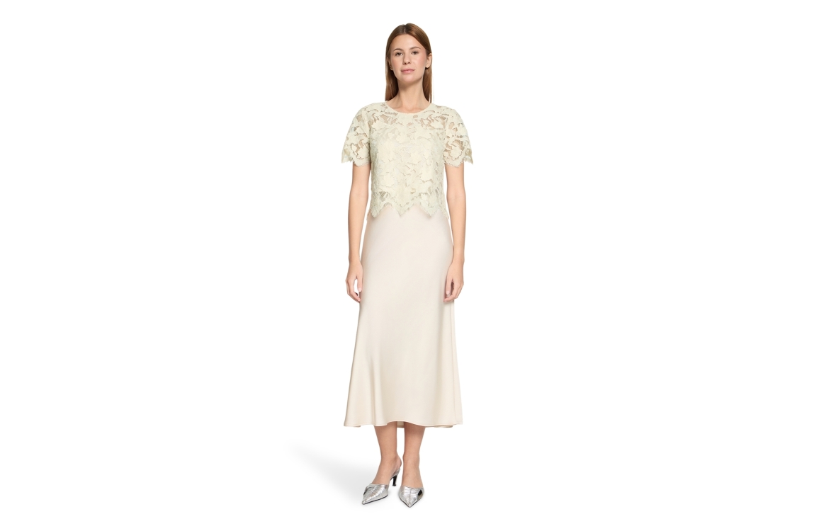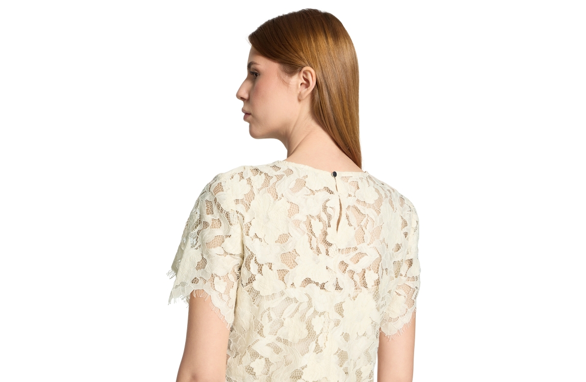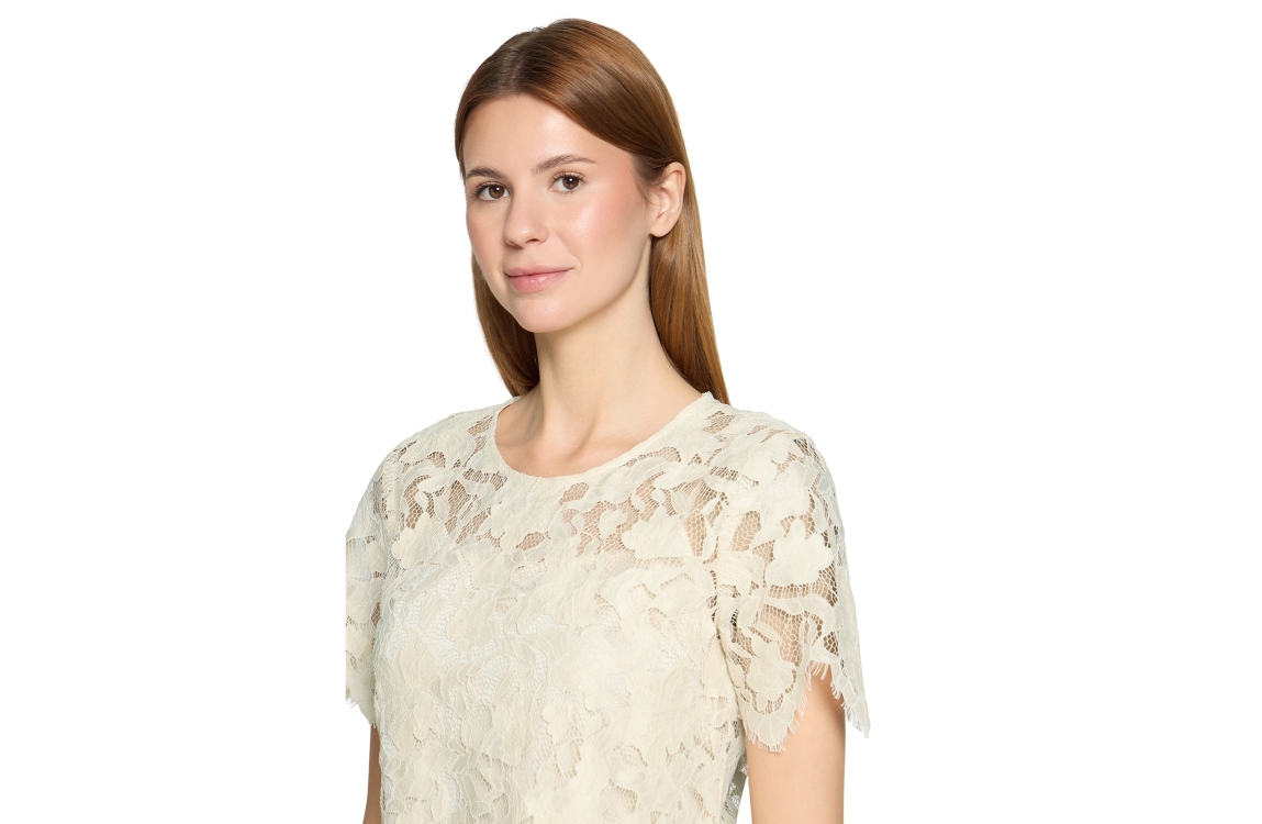 Vera Mont top 36464066. Dit rechtvallend model heeft een ronde hals en korte mouwen. Deze beige top van Vera Mont is uitgevoerd in een kanten materiaal en sluit aan de achterzijde door middel van een knoopje. Dit model is gevoerd.