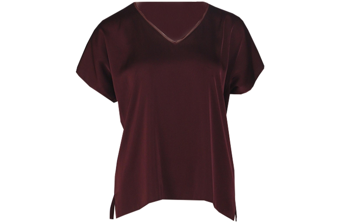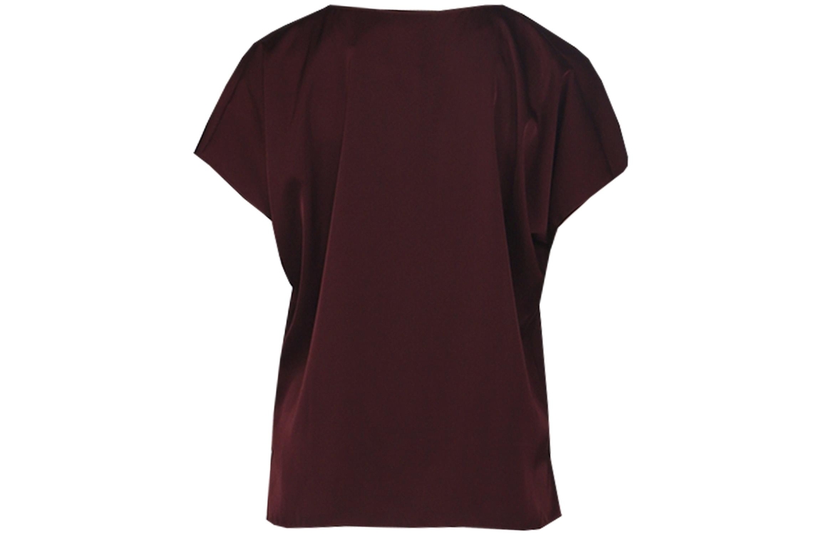 Vera Mont top 0342/4262/4715. Dit rechtvallende model heeft een V-hals en korte mouwen met afhangende schoudernaden. Deze bordeaux rode top van Vera Mont is uitgevoerd in een satijnen-look en heeft afgewerkte boorden.