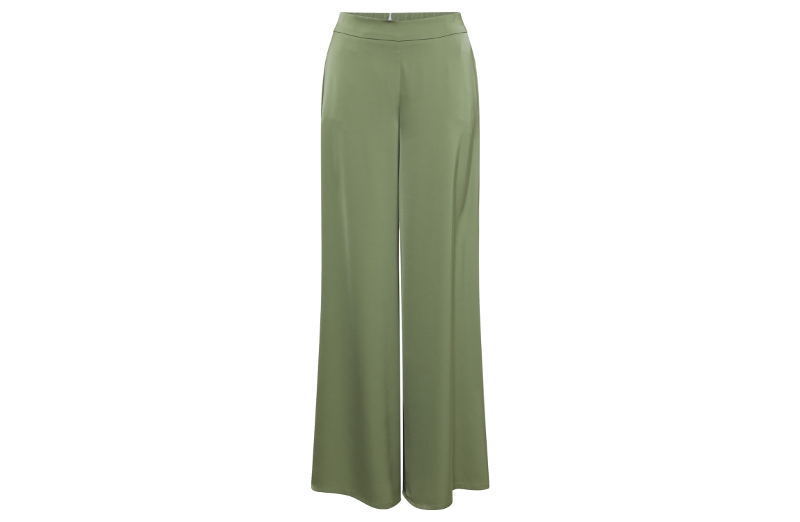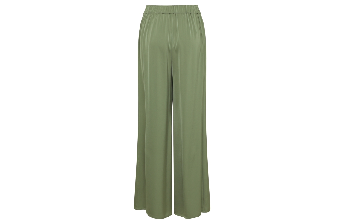 Vera Mont broek 03004262. Dit wijdvallende model is voorzien van een elastische band en heeft lange pijpen. Dit groene model van Vera Mont is voorzien van naadzakken en is uitgevoerd in een satijn-achtige kwaliteit.