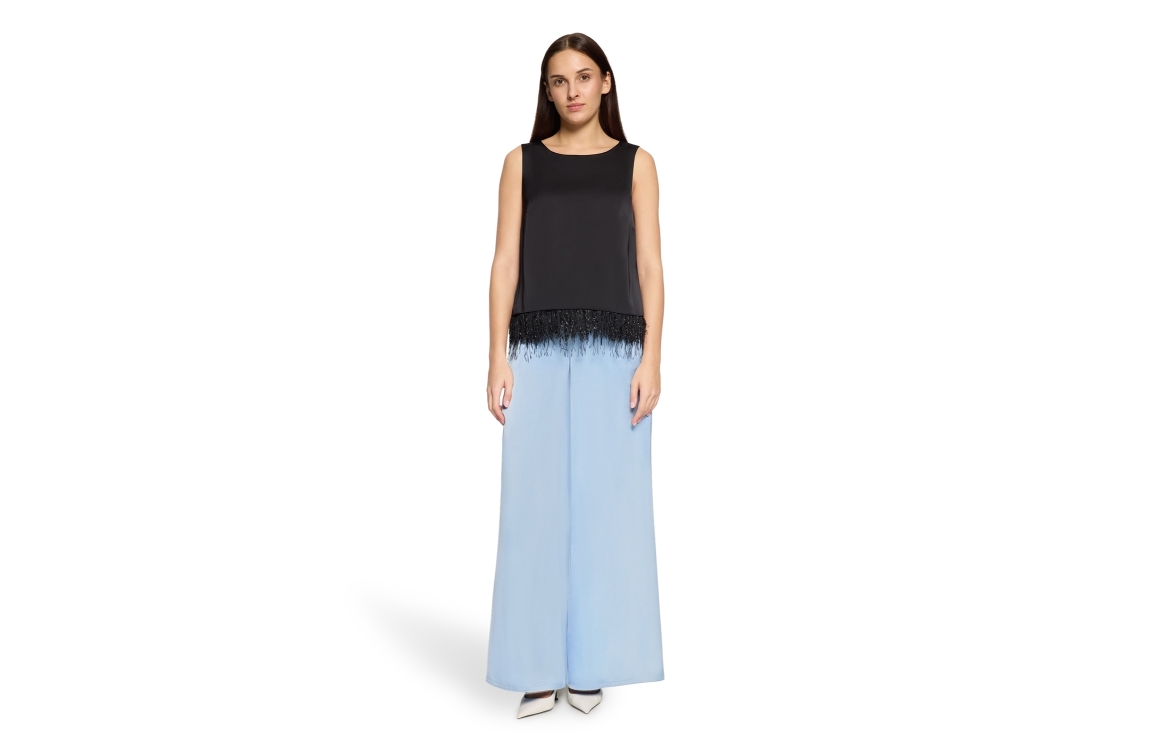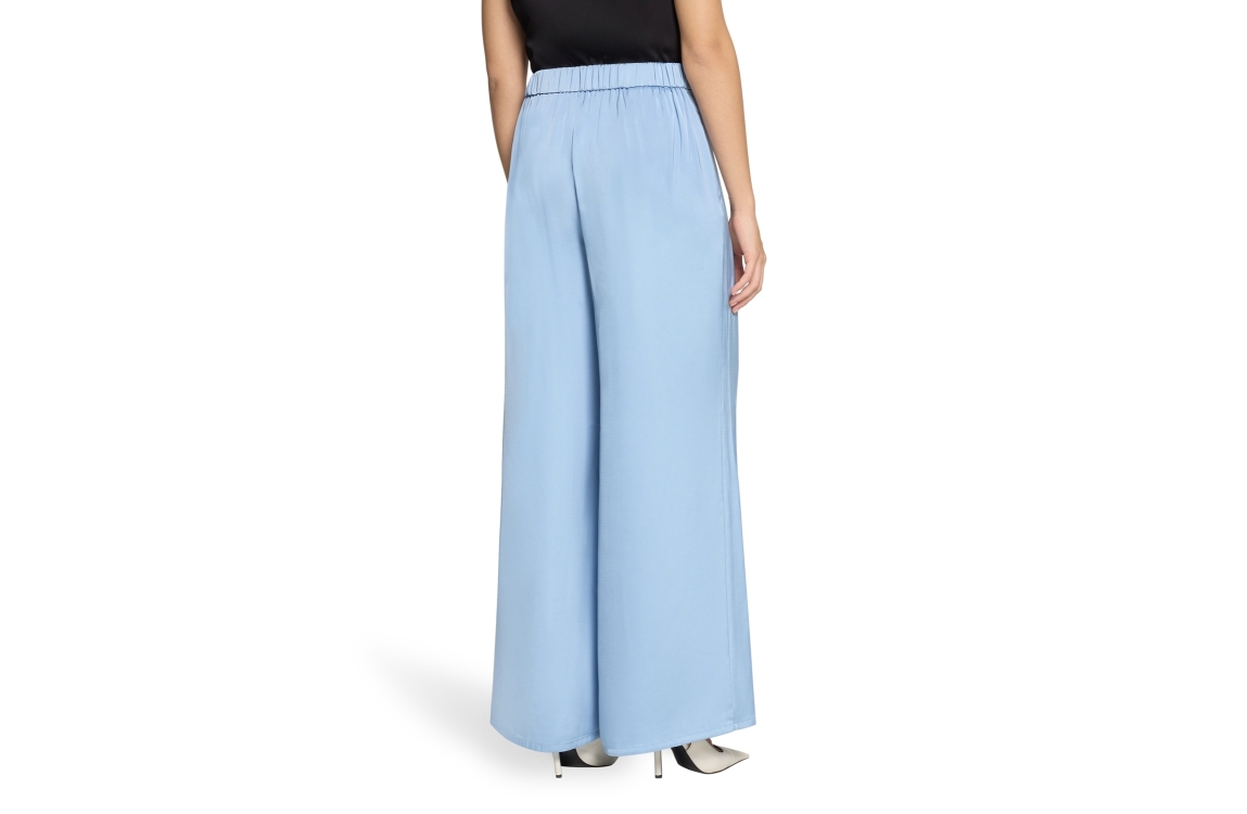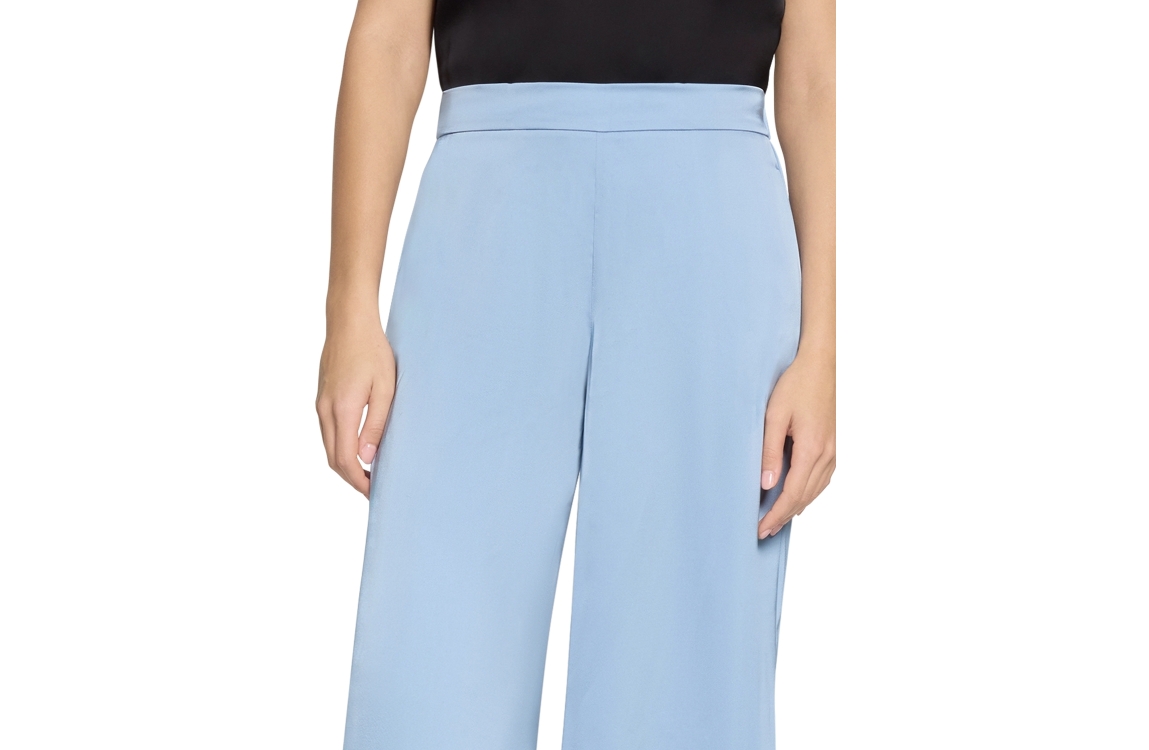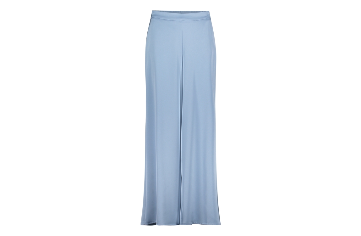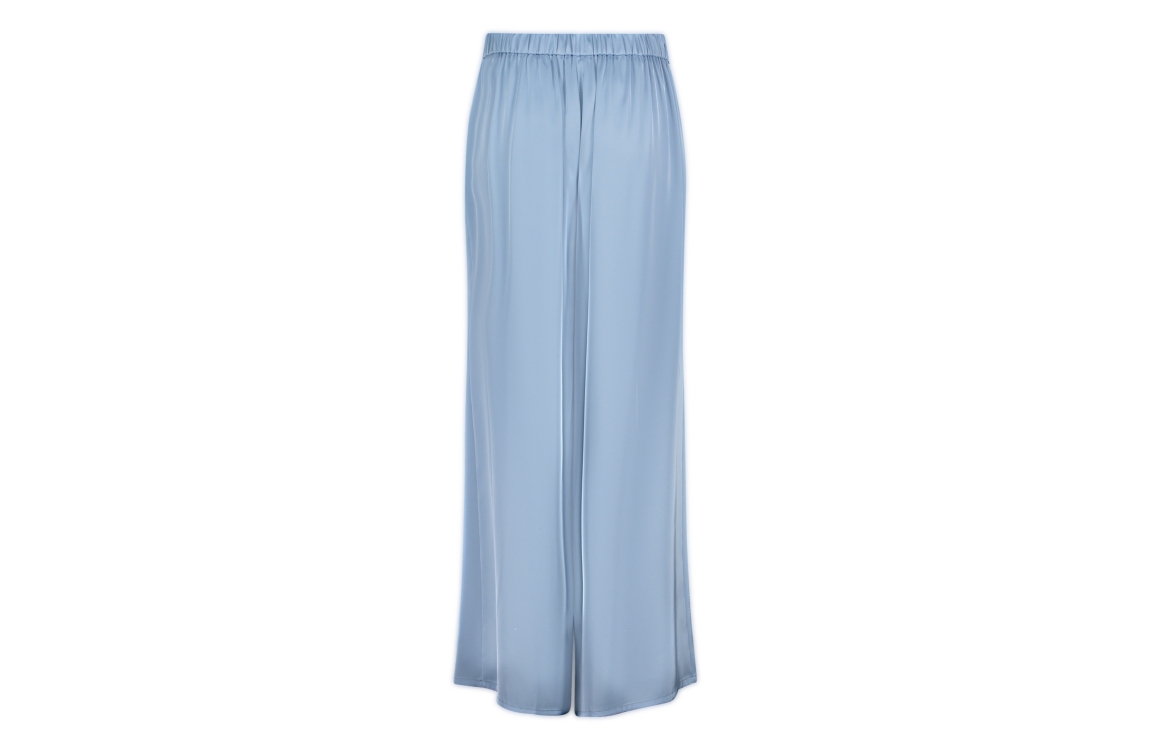 Vera Mont broek 03004262. Dit wijdvallende model is voorzien van een elastische band en heeft lange broekspijpen. Dit lichtblauwe model van Vera Mont is voorzien van naadzakken en is uitgevoerd in een satijn-achtige kwaliteit.
