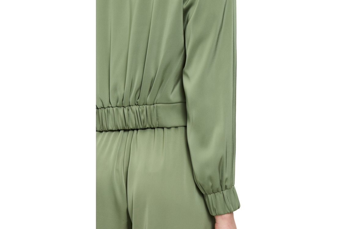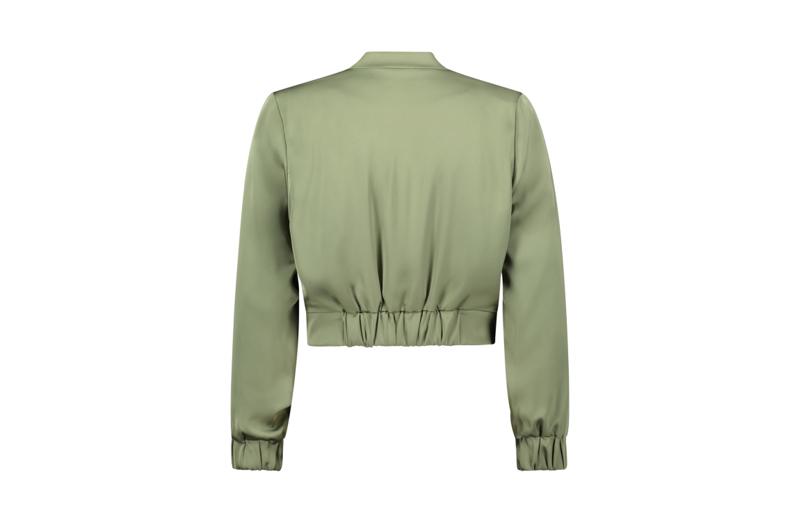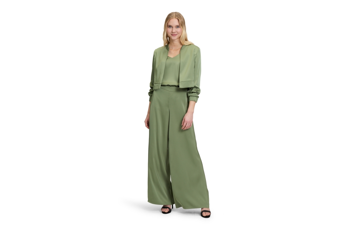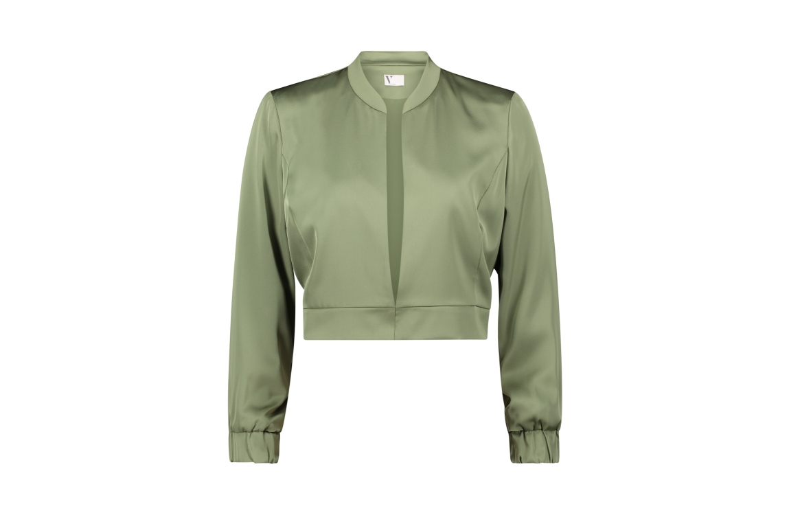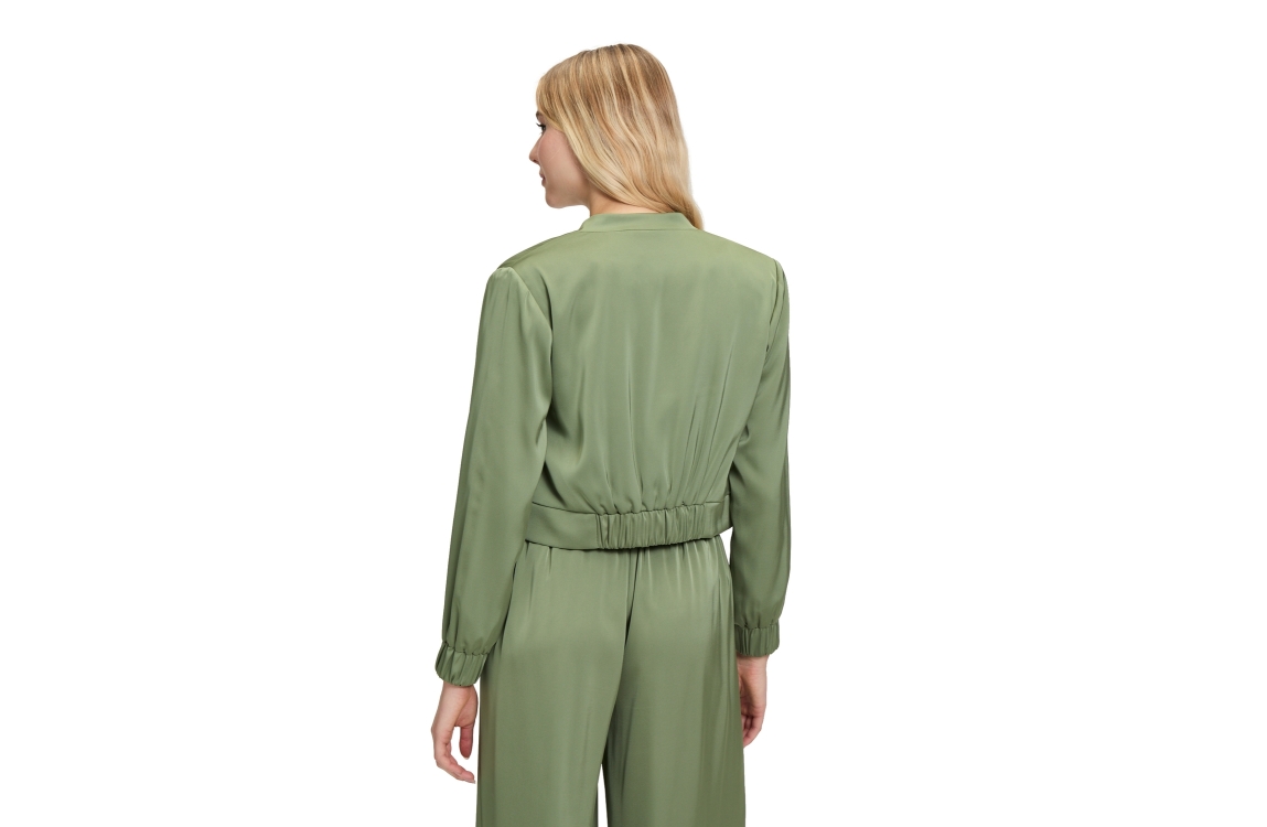 Vera Mont jasje 03054262. Dit cropped model heeft een ronde hals en lange mouwen. Dit groene jasje van Vera Mont is uitgevoerd in een bomber model, beschikt over schoudervulling en is afgewerkt met een elastische boord aan de onderzijde.