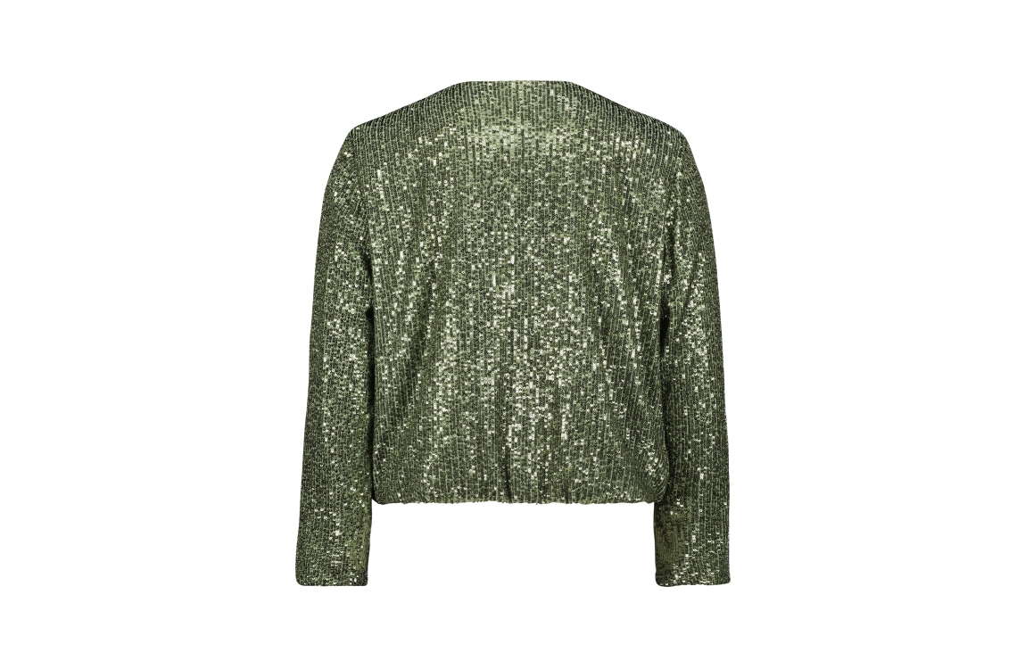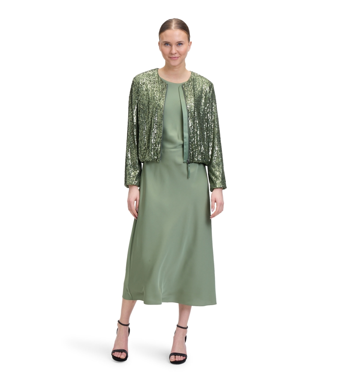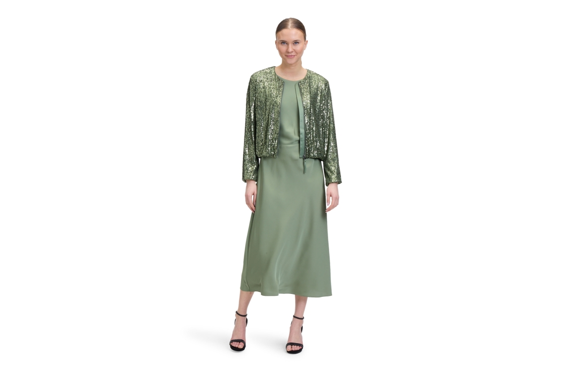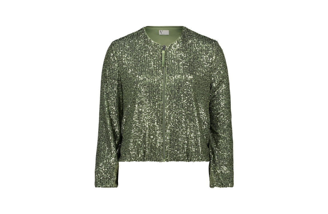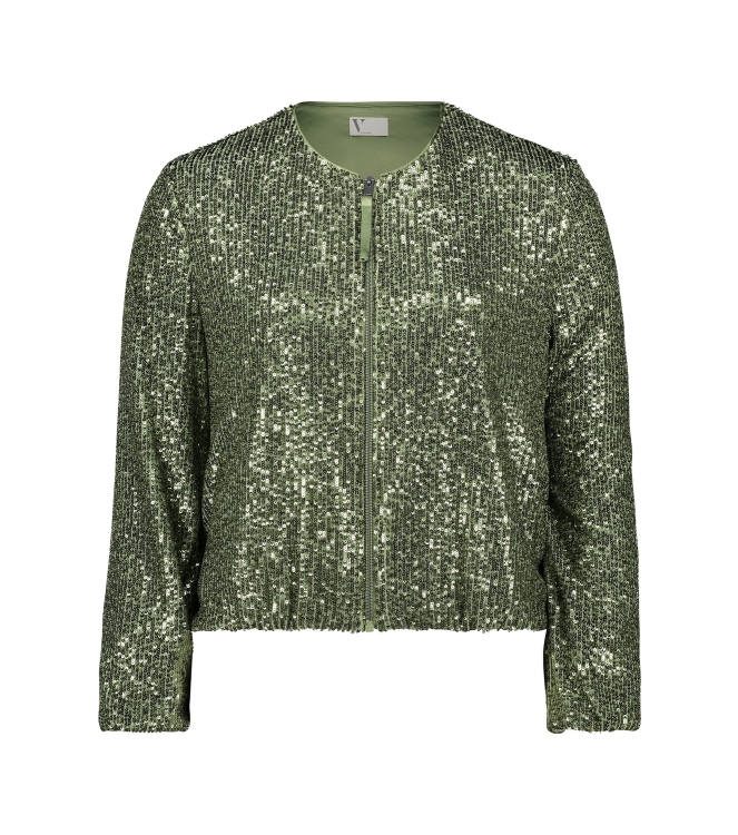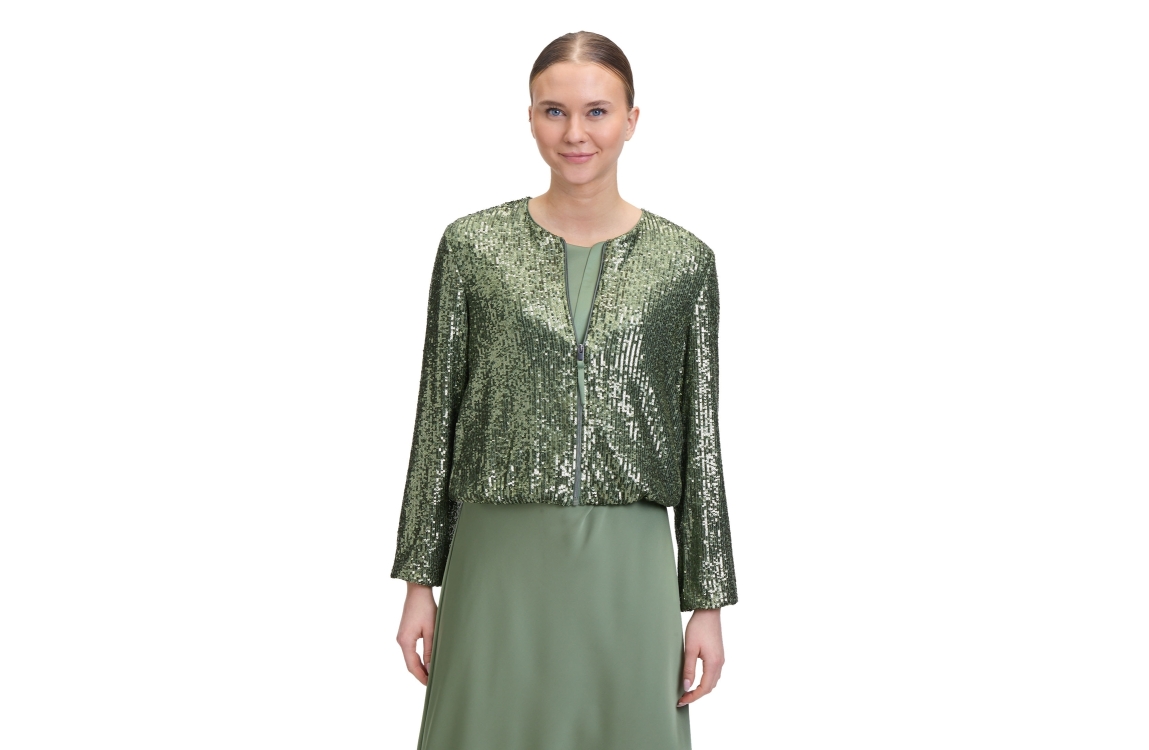 Vera Mont jasje 35414478. Dit regular fit model heeft een ronde hals, lange mouwen en sluit door middel van een rits. Dit groene jasje van Vera Mont is bewerkt met pailletten.