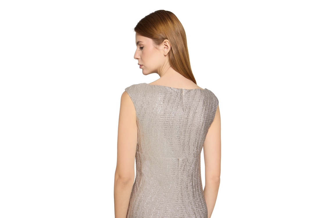 Vera Mont jurk 03864082. Dit rechtvallend model heeft een ronde watervalhals, is mouwloos en sluit door middel van een rits. Deze zilveren jurk van Vera Mont is voorzien van een luxe gesp en is afgewerkt met split. De jurk bevat stretch.